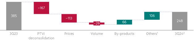 1 Excluding Brumadinho expenses. 3Q23 EBITDA was restated including associates and JV’s EBITDA (US$ 254 million). 2 Including by-products (US$ 66 million), EBITDA Energy (US$ 5 million) and Associates and JVs EBITDA (US$ -12 million).