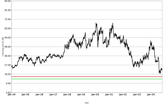 The following graph sets forth historical closing values of the Underlier for the period from January 1, 2014 to October 24, 2024. The red line represents the Coupon Threshold and the green line represents the Barrier Value. We obtained the information in the graph from Bloomberg Financial Markets, without independent investigation. We cannot give you assurance that the performance of the Underlier will result in the return of all of your initial investment.