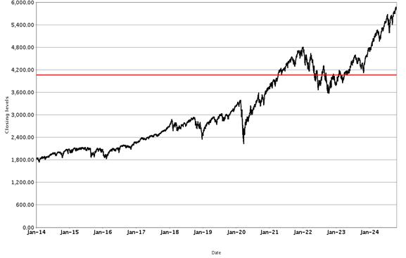 The following graphs set forth historical closing values of the Underlyings for the period from January 1, 2014 to October 23, 2024. Each solid line represents the Coupon Barrier and Downside Threshold of the relevant Underlying. We obtained the information in the graphs from Bloomberg Financial Markets, without independent investigation. The historical performance of the Underlyings should not be taken as an indication of their future performance. We cannot give you assurance that the performance of the Underlyings will result in the return of all of your initial investment.