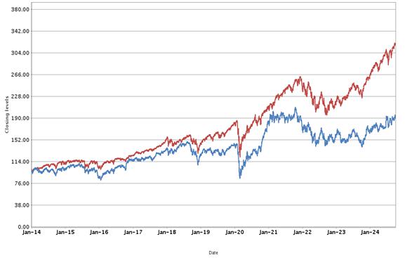 The graph below illustrates the daily performance of the Underlyings from January 1, 2014 through October 23, 2024. For comparison purposes, each Underlying has been normalized to have a closing value of 100.00 on January 1, 2014 by dividing the closing value of that Underlying on each day by the closing value of that Underlying on October 23, 2024 and multiplying by 100.00. We obtained the closing values used to determine the normalized closing values set forth below from Bloomberg L.P., without independent verification.