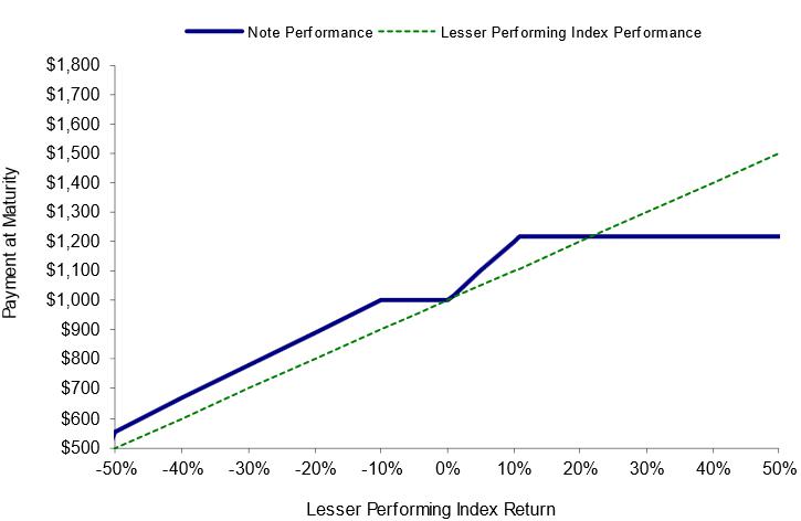 | · | If the closing level of the Lesser Performing Index increases 5.00%, investors will receive at maturity a return equal to 10.00%, or $1,100.00 per $1,000 principal amount note. |
