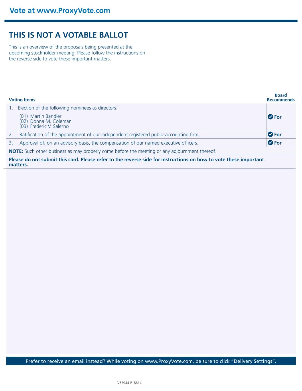 THIS IS NOT A VOTABLE BALLOT This is an overview of the proposals being presented at the upcoming stockholder meeting. Please follow the instructions on the reverse side to vote these important matters. Vote at www.ProxyVote.com Prefer to receive an email instead? While voting on www.ProxyVote.com, be sure to click “Delivery Settings”. Voting Items Board Recommends V57944-P18614 1. Election of the following nominees as directors: For(01) Martin Bandier (02) Donna M. Coleman (03) Frederic V. Salerno 2. Ratification of the appointment of our independent registered public accounting firm. For 3. Approval of, on an advisory basis, the compensation of our named executive officers. For NOTE: Such other business as may properly come before the meeting or any adjournment thereof. Please do not submit this card. Please refer to the reverse side for instructions on how to vote these important matters.