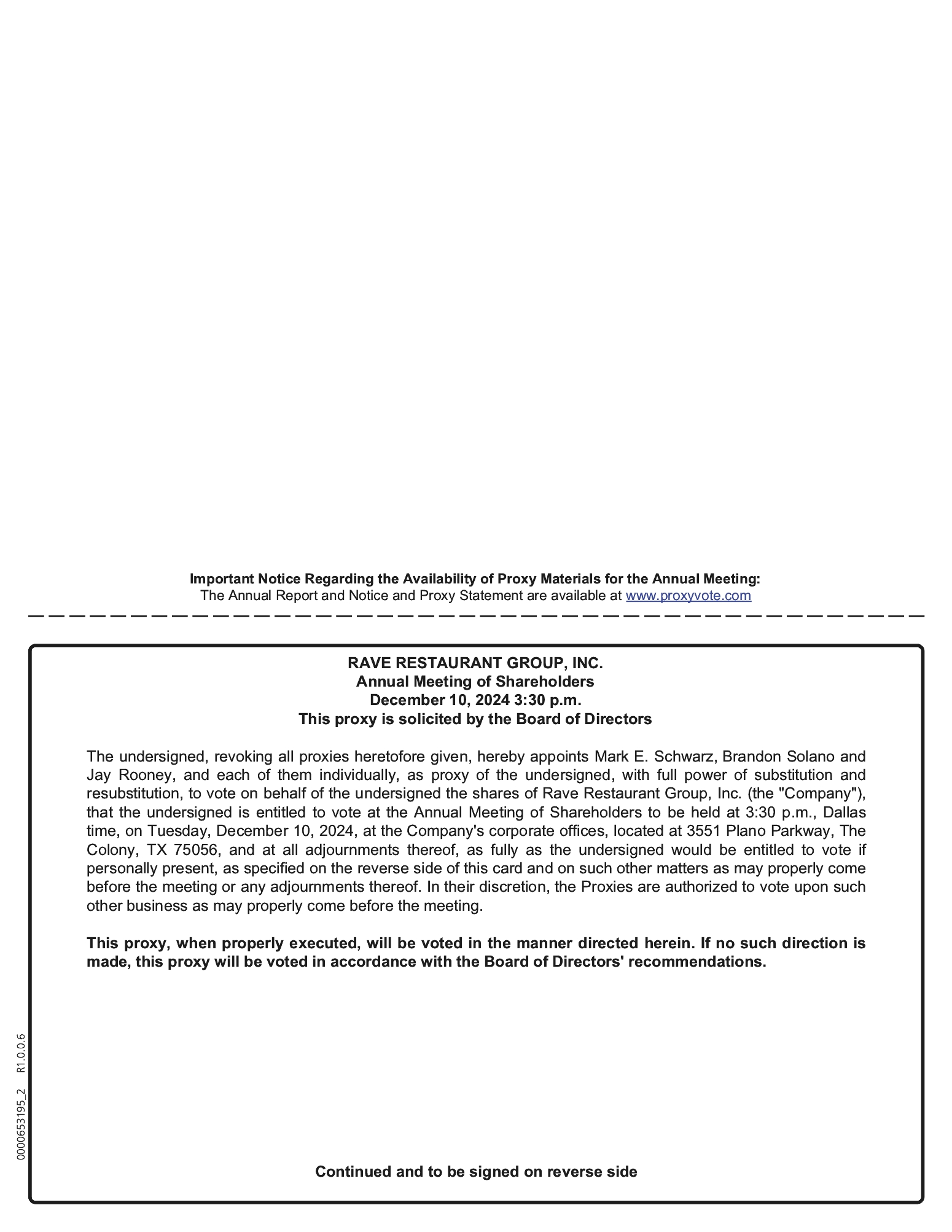 We are pleased to invite you to the Annual Meeting of Shareholders of RAVE Restaurant Group, Inc. to be held at the company’s corporate offices, located at 3551 Plano Parkway, The Colony, Texas 75056, on Tuesday, December 10, 2024, at 3:30 p.m., local time.