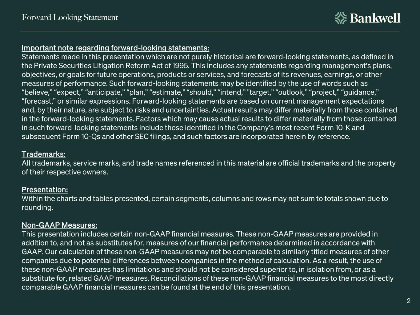•The Company continues to invest for future growth, with notable recent developments including a lending partnership with Lendio, the launch of Bankwell Direct, the launch of a new Small Business Administration (SBA) division, and hiring key leadership personnel.