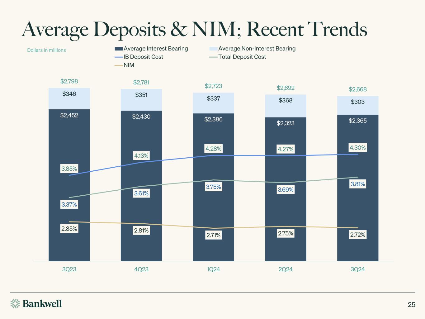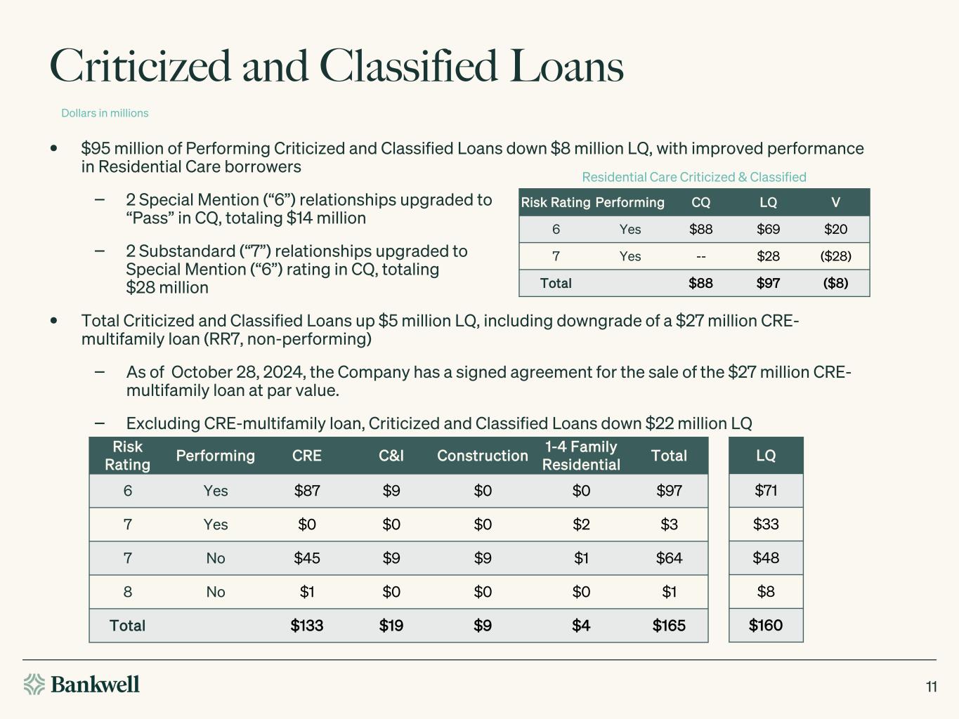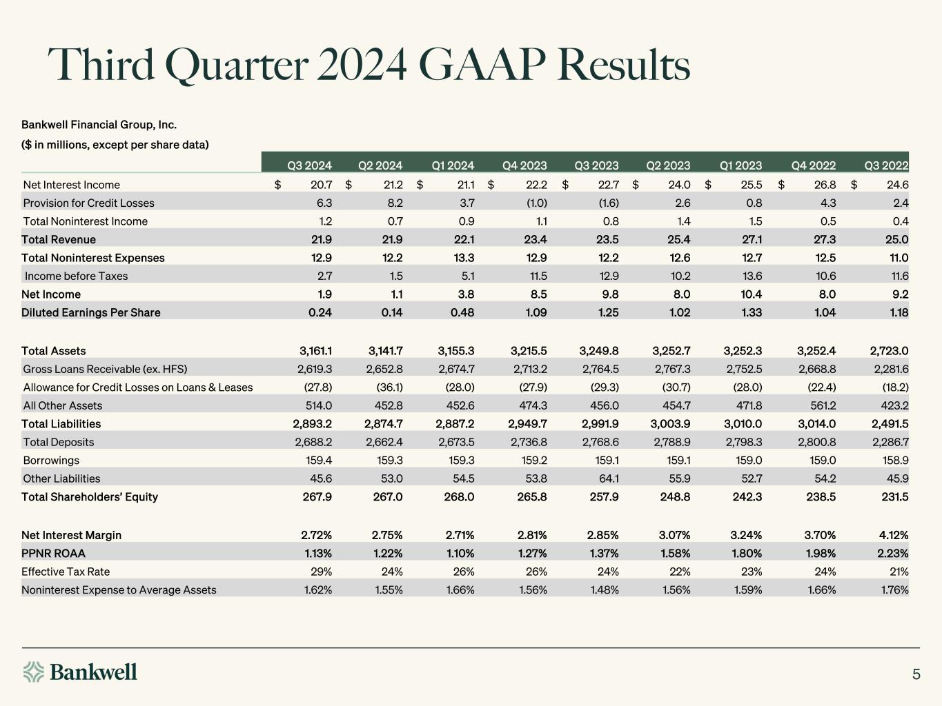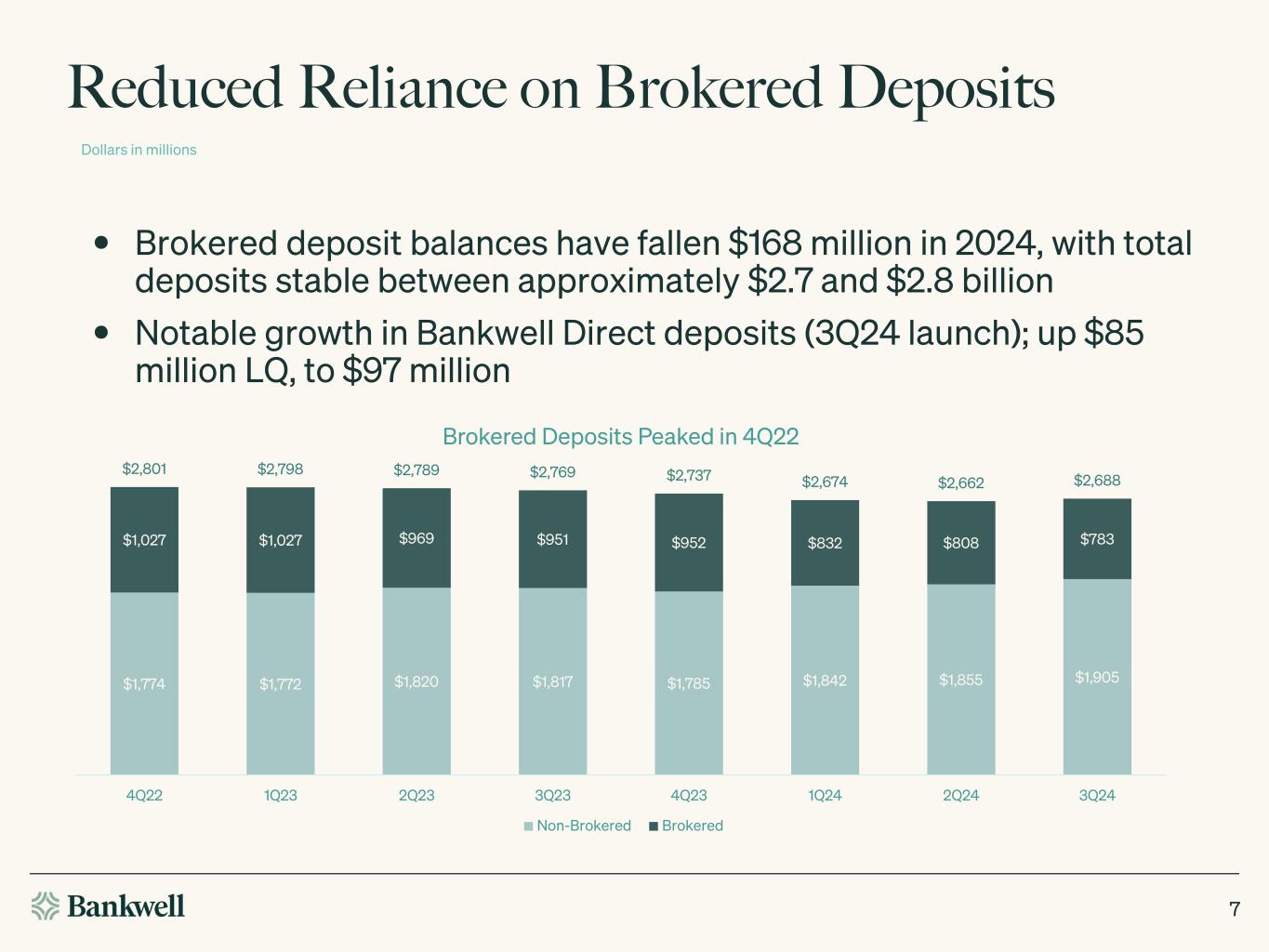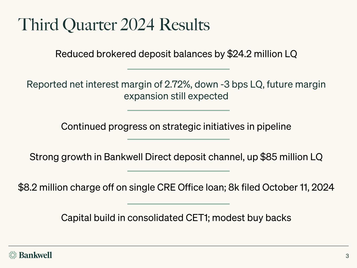 •Brokered deposits declined $24.2 million in the third quarter of 2024 and are down $168.5 million since December 31, 2023.