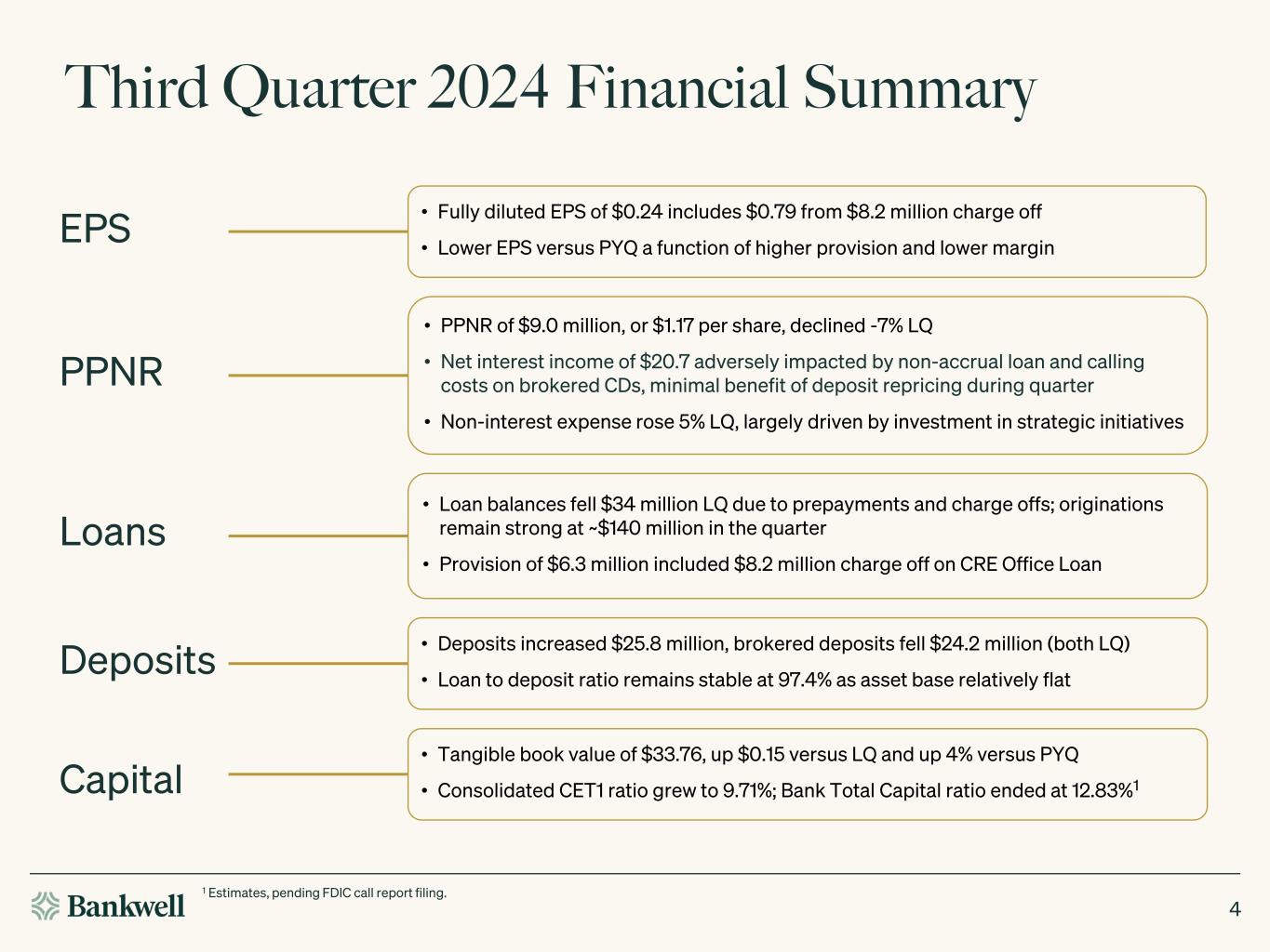 Third Quarter 2024 Results 3 Reduced brokered deposit balances by $24.2 million LQ Reported net interest margin of 2.72%, down -3 bps LQ, future margin expansion still expected Continued progress on strategic initiatives in pipeline Strong growth in Bankwell Direct deposit channel, up $85 million LQ $8.2 million charge off on single CRE Office loan; 8k filed October 11, 2024 Capital build in consolidated CET1; modest buy backs