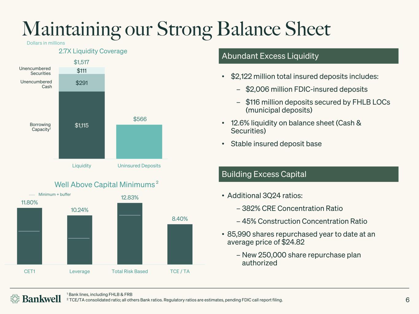 Third Quarter 2024 GAAP Results 5 Bankwell Financial Group, Inc. ($ in millions, except per share data) Q3 2024 Q2 2024 Q1 2024 Q4 2023 Q3 2023 Q2 2023 Q1 2023 Q4 2022 Q3 2022 Net Interest Income $ 20.7 $ 21.2 $ 21.1 $ 22.2 $ 22.7 $ 24.0 $ 25.5 $ 26.8 $ 24.6 Provision for Credit Losses 6.3 8.2 3.7 (1.0) (1.6) 2.6 0.8 4.3 2.4 Total Noninterest Income 1.2 0.7 0.9 1.1 0.8 1.4 1.5 0.5 0.4 Total Revenue 21.9 21.9 22.1 23.4 23.5 25.4 27.1 27.3 25.0 Total Noninterest Expenses 12.9 12.2 13.3 12.9 12.2 12.6 12.7 12.5 11.0 Income before Taxes 2.7 1.5 5.1 11.5 12.9 10.2 13.6 10.6 11.6 Net Income 1.9 1.1 3.8 8.5 9.8 8.0 10.4 8.0 9.2 Diluted Earnings Per Share 0.24 0.14 0.48 1.09 1.25 1.02 1.33 1.04 1.18 Total Assets 3,161.1 3,141.7 3,155.3 3,215.5 3,249.8 3,252.7 3,252.3 3,252.4 2,723.0 Gross Loans Receivable (ex. HFS) 2,619.3 2,652.8 2,674.7 2,713.2 2,764.5 2,767.3 2,752.5 2,668.8 2,281.6 Allowance for Credit Losses on Loans & Leases (27.8) (36.1) (28.0) (27.9) (29.3) (30.7) (28.0) (22.4) (18.2) All Other Assets 514.0 452.8 452.6 474.3 456.0 454.7 471.8 561.2 423.2 Total Liabilities 2,893.2 2,874.7 2,887.2 2,949.7 2,991.9 3,003.9 3,010.0 3,014.0 2,491.5 Total Deposits 2,688.2 2,662.4 2,673.5 2,736.8 2,768.6 2,788.9 2,798.3 2,800.8 2,286.7 Borrowings 159.4 159.3 159.3 159.2 159.1 159.1 159.0 159.0 158.9 Other Liabilities 45.6 53.0 54.5 53.8 64.1 55.9 52.7 54.2 45.9 Total Shareholders’ Equity 267.9 267.0 268.0 265.8 257.9 248.8 242.3 238.5 231.5 Net Interest Margin 2.72% 2.75% 2.71% 2.81% 2.85% 3.07% 3.24% 3.70% 4.12% PPNR ROAA 1.13% 1.22% 1.10% 1.27% 1.37% 1.58% 1.80% 1.98% 2.23% Effective Tax Rate 29% 24% 26% 26% 24% 22% 23% 24% 21% Noninterest Expense to Average Assets 1.62% 1.55% 1.66% 1.56% 1.48% 1.56% 1.59% 1.66% 1.76%