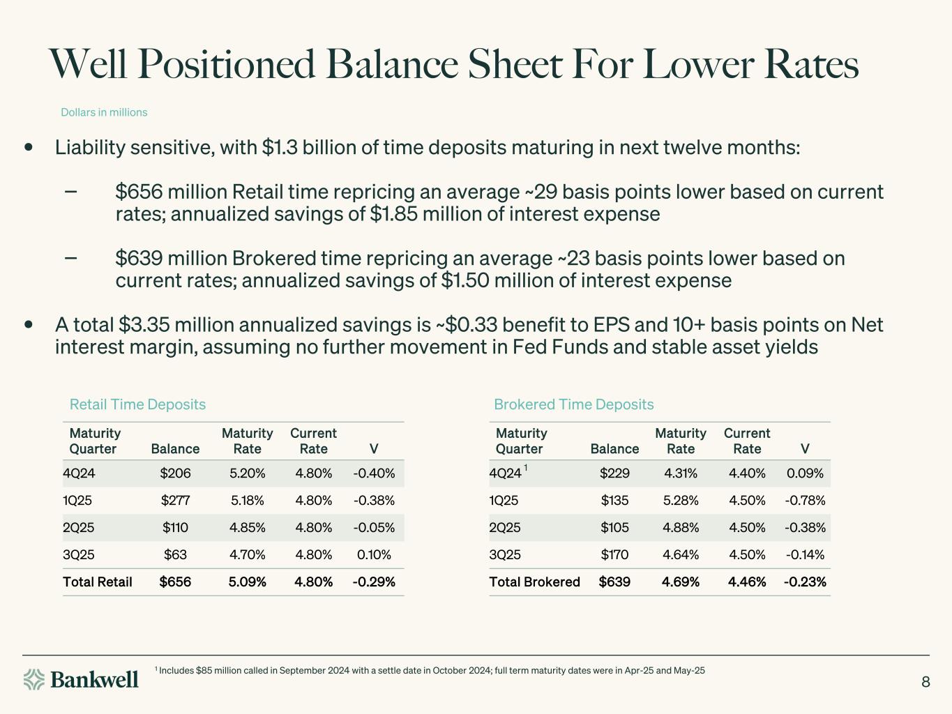 •With $1.3 billion of time deposits maturing in the next 12 months at a weighted average rate of 4.89%, the Company anticipates an annualized reduction in funding costs by $3.35 million, given current pricing. This translates into approximately $0.33 incremental EPS, or approximately 11 basis points on net interest margin, given no further changes to Fed Funds and stable asset yields.