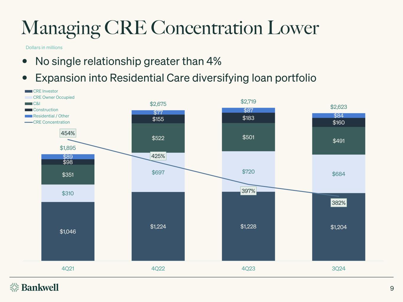 Loan Composition Dollars in millions Total Loan Portfolio = $2,623 million Favorable long-term trends in Investor CREResidential 1.7% C&I 18.7% CRE Owner Occupied 26.1% CRE Investor 45.9% Commercial Const. 6.1% Other 1.5% 60.4% 55.2% 45.8% 45.2% 45.9% 27.3% 34.9% 45.5% 44.9% 44.8% 4Q20 4Q21 4Q22 4Q23 3Q24 CRE Investor CRE O/O + C&I 26