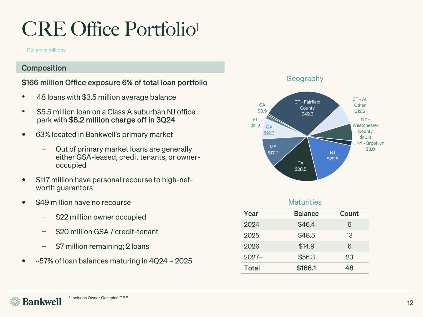 CRE Office Portfolio1 1 Includes Owner Occupied CRE 12 Geography Dollars in millions CT - Fairfield County $49.3 CT - All Other $12.2 NY - Westchester County $10.3 NY - Brooklyn $3.0 NJ $29.6 TX $28.5 MS $17.7 GA $12.3 FL $2.2 CA $0.9 Composition $166 million Office exposure 6% of total loan portfolio • 48 loans with $3.5 million average balance • $5.5 million loan on a Class A suburban NJ office park with $8.2 million charge off in 3Q24 • 63% located in Bankwell’s primary market ‒ Out of primary market loans are generally either GSA-leased, credit tenants, or owner- occupied • $117 million have personal recourse to high-net- worth guarantors • $49 million have no recourse ‒ $22 million owner occupied ‒ $20 million GSA / credit-tenant ‒ $7 million remaining; 2 loans • ~57% of loan balances maturing in 4Q24 – 2025 Maturities Year Balance Count 2024 $46.4 6 2025 $48.5 13 2026 $14.9 6 2027+ $56.3 23 Total $166.1 48