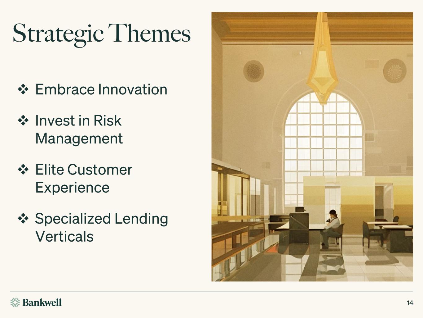 14 Strategic Themes Embrace Innovation Invest in Risk Management Elite Customer Experience Specialized Lending Verticals