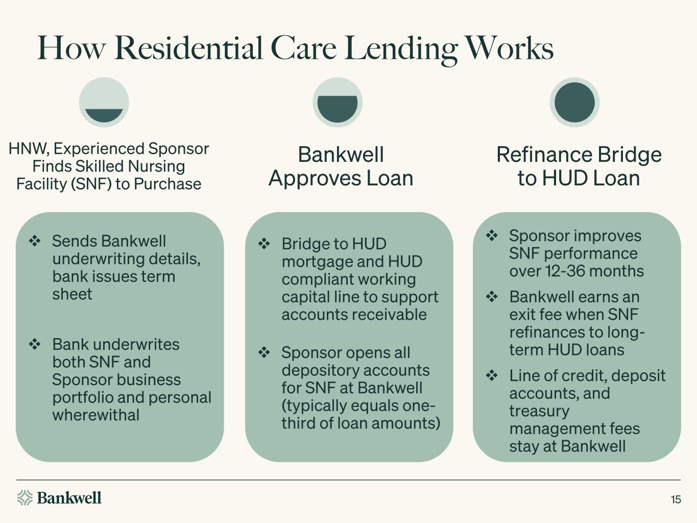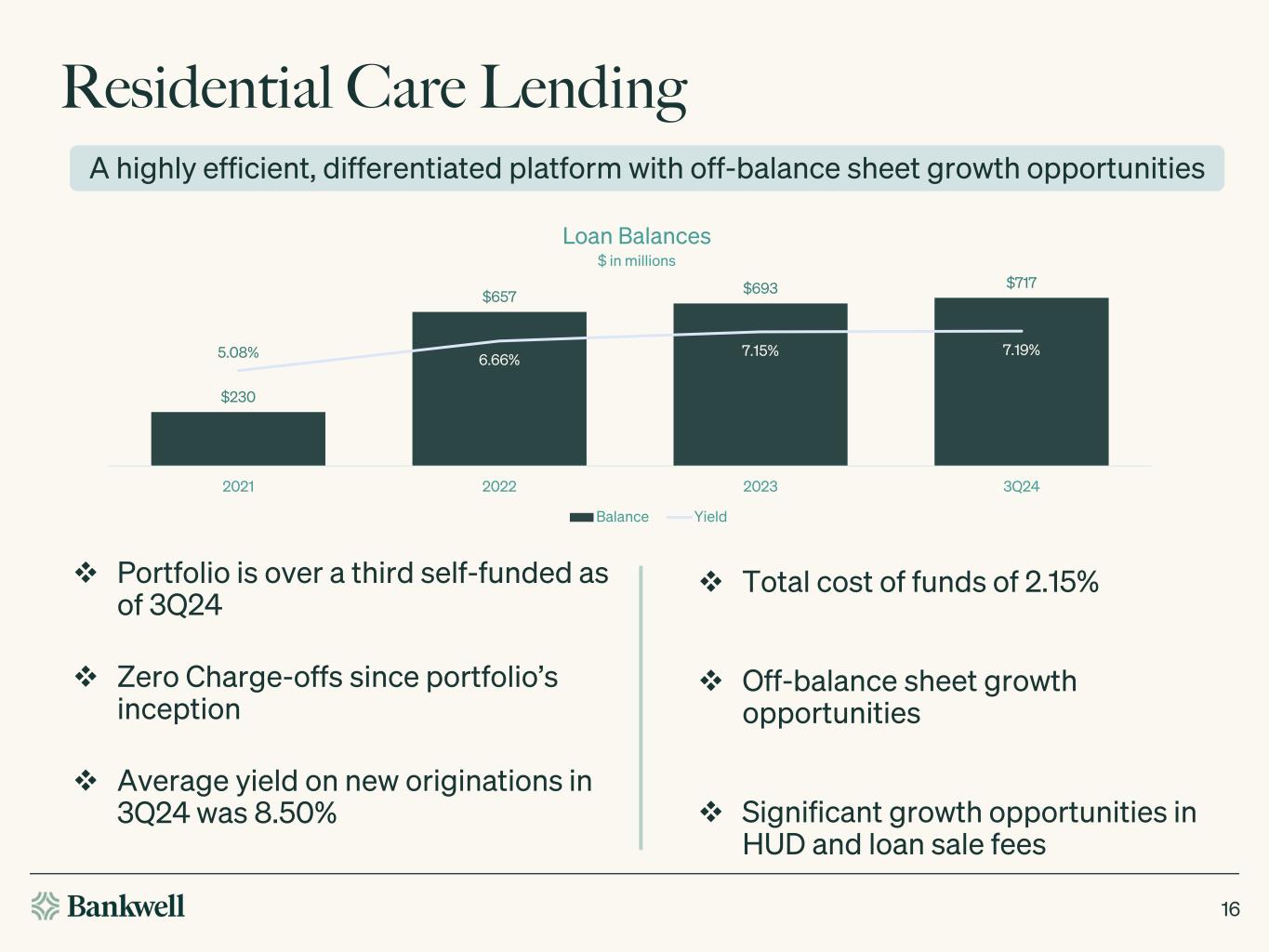 How Residential Care Lending Works 15 HNW, Experienced Sponsor Finds Skilled Nursing Facility (SNF) to Purchase Bankwell Approves Loan Refinance Bridge to HUD Loan Sends Bankwell underwriting details, bank issues term sheet Bank underwrites both SNF and Sponsor business portfolio and personal wherewithal Bridge to HUD mortgage and HUD compliant working capital line to support accounts receivable Sponsor opens all depository accounts for SNF at Bankwell (typically equals one- third of loan amounts) Sponsor improves SNF performance over 12-36 months Bankwell earns an exit fee when SNF refinances to long- term HUD loans Line of credit, deposit accounts, and treasury management fees stay at Bankwell