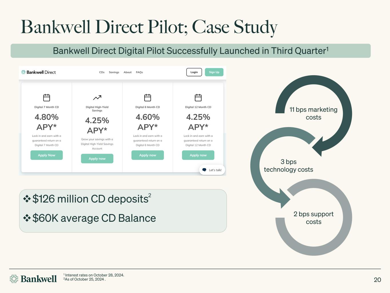 Bankwell Direct Pilot; Case Study 20 Bankwell Direct Digital Pilot Successfully Launched in Third Quarter1 11 bps marketing costs 3 bps technology costs 2 bps support costs $126 million CD deposits $60K average CD Balance 1 Interest rates on October 28, 2024. 2As of October 25, 2024 . 2
