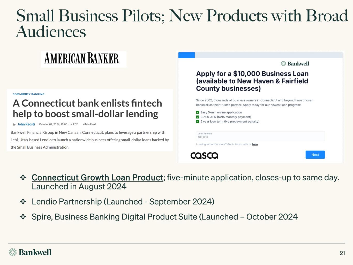 Small Business Pilots; New Products with Broad Audiences 21 Connecticut Growth Loan Product; five-minute application, closes-up to same day. Launched in August 2024 Lendio Partnership (Launched - September 2024) Spire, Business Banking Digital Product Suite (Launched – October 2024