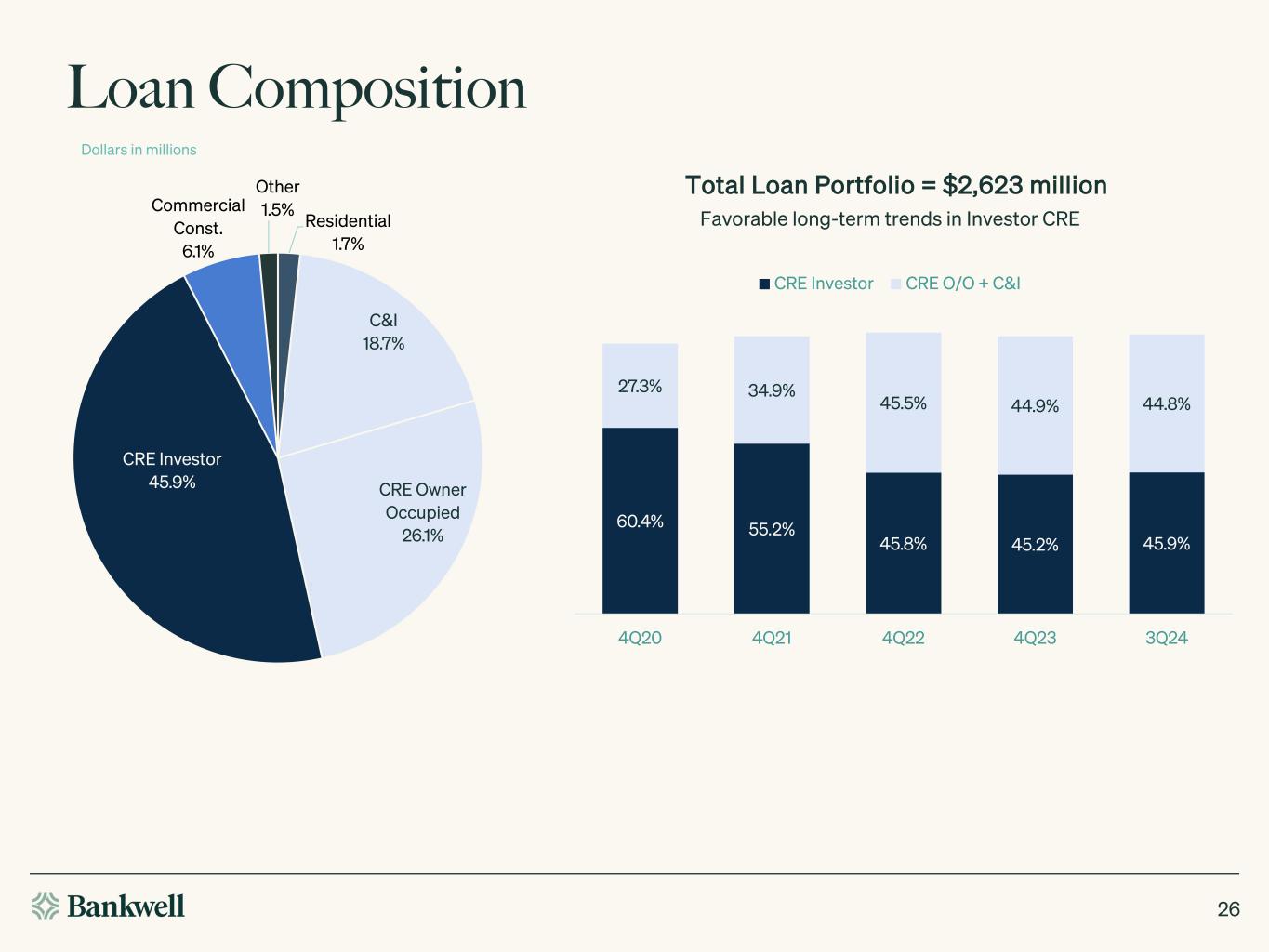 Average Deposits & NIM; Recent Trends Dollars in millions 25 $2,452 $2,430 $2,386 $2,323 $2,365 $346 $351 $337 $368 $303 $2,798 $2,781 $2,723 $2,692 $2,668 3.85% 4.13% 4.28% 4.27% 4.30% 3.37% 3.61% 3.75% 3.69% 3.81% 2.85% 2.81% 2.71% 2.75% 2.72% 2.00% 2.50% 3.00% 3.50% 4.00% 4.50% 5.00% 5.50% 6.00% $0 $500 $1,000 $1,500 $2,000 $2,500 $3,000 3Q23 4Q23 1Q24 2Q24 3Q24 Average Interest Bearing Average Non-Interest Bearing IB Deposit Cost Total Deposit Cost NIM