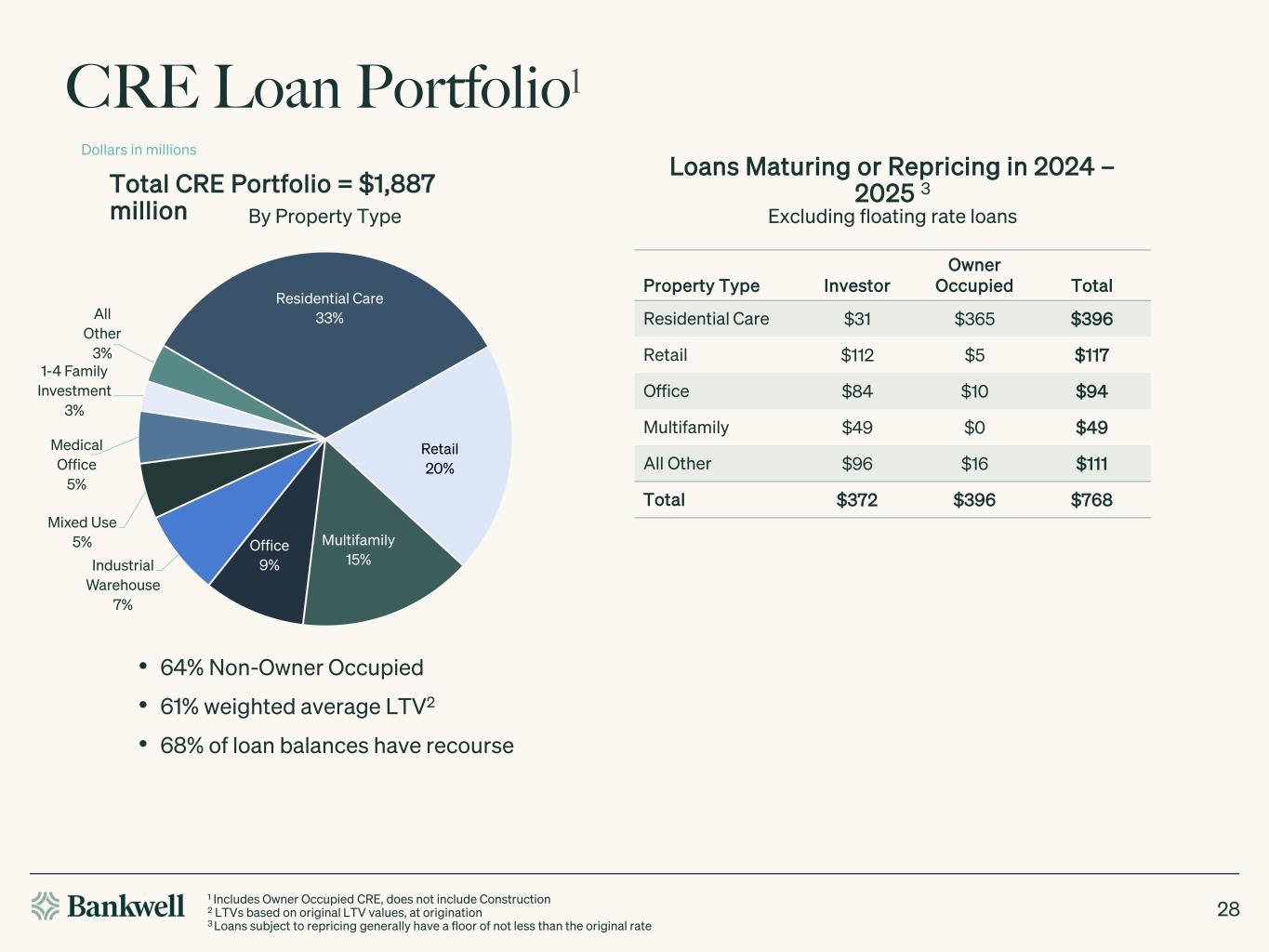 CRE Loan Portfolio1 • 64% Non-Owner Occupied • 61% weighted average LTV2 • 68% of loan balances have recourse Dollars in millions Residential Care 33% Retail 20% Multifamily 15% Office 9%Industrial Warehouse 7% Mixed Use 5% Medical Office 5% 1-4 Family Investment 3% All Other 3% Property Type Investor Owner Occupied Total Residential Care $31 $365 $396 Retail $112 $5 $117 Office $84 $10 $94 Multifamily $49 $0 $49 All Other $96 $16 $111 Total $372 $396 $768 Loans Maturing or Repricing in 2024 – 2025 3 Excluding floating rate loans Total CRE Portfolio = $1,887 million By Property Type 1 Includes Owner Occupied CRE, does not include Construction 2 LTVs based on original LTV values, at origination 3 Loans subject to repricing generally have a floor of not less than the original rate 28