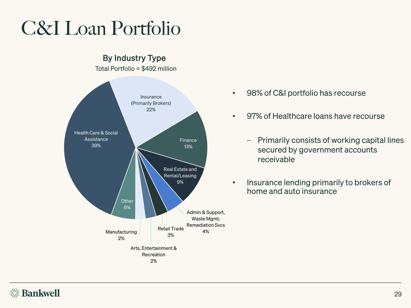 C&I Loan Portfolio 29 By Industry Type Total Portfolio = $492 million Health Care & Social Assistance 39% Insurance (Primarily Brokers) 22% Finance 13% Real Estate and Rental/Leasing 9% Admin & Support, Waste Mgmt, Remediation Svcs 4%Retail Trade 3% Arts, Entertainment & Recreation 2% Manufacturing 2% Other 6% • 98% of C&I portfolio has recourse • 97% of Healthcare loans have recourse – Primarily consists of working capital lines secured by government accounts receivable • Insurance lending primarily to brokers of home and auto insurance