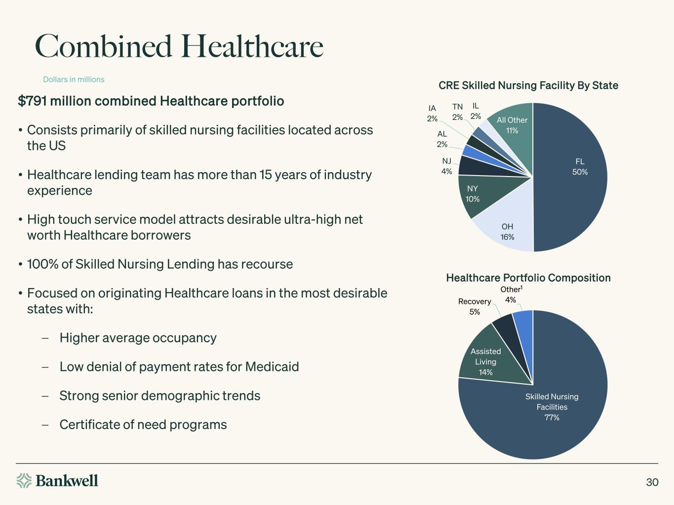 Combined Healthcare Dollars in millions 30 Skilled Nursing Facilities 77% Assisted Living 14% Recovery 5% Other 4% $791 million combined Healthcare portfolio • Consists primarily of skilled nursing facilities located across the US • Healthcare lending team has more than 15 years of industry experience • High touch service model attracts desirable ultra-high net worth Healthcare borrowers • 100% of Skilled Nursing Lending has recourse • Focused on originating Healthcare loans in the most desirable states with: – Higher average occupancy – Low denial of payment rates for Medicaid – Strong senior demographic trends – Certificate of need programs 1 Healthcare Portfolio Composition CRE Skilled Nursing Facility By State FL 50% OH 16% NY 10% NJ 4% AL 2% IA 2% TN 2% IL 2% All Other 11%
