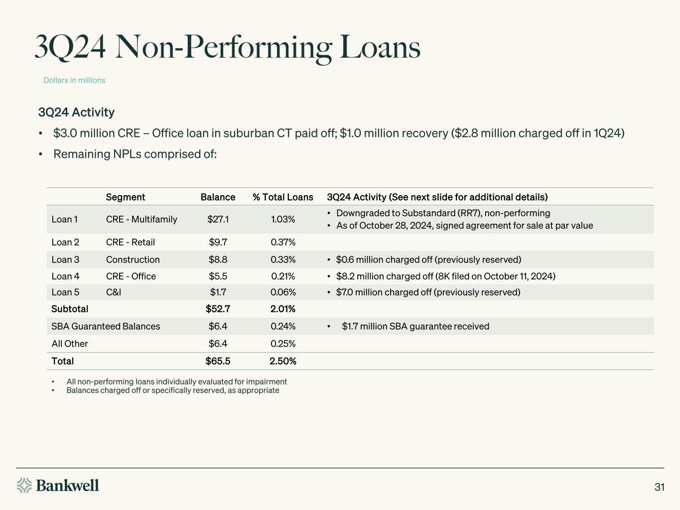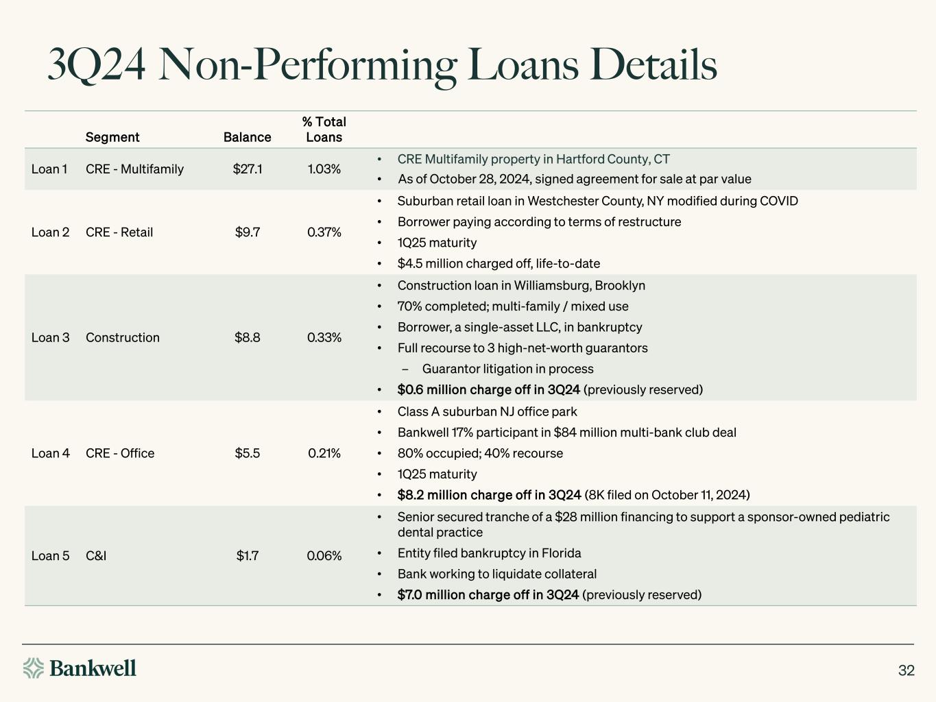 3Q24 Non-Performing Loans Segment Balance % Total Loans 3Q24 Activity (See next slide for additional details) Loan 1 CRE - Multifamily $27.1 1.03% • Downgraded to Substandard (RR7), non-performing • As of October 28, 2024, signed agreement for sale at par value Loan 2 CRE - Retail $9.7 0.37% Loan 3 Construction $8.8 0.33% • $0.6 million charged off (previously reserved) Loan 4 CRE - Office $5.5 0.21% • $8.2 million charged off (8K filed on October 11, 2024) Loan 5 C&I $1.7 0.06% • $7.0 million charged off (previously reserved) Subtotal $52.7 2.01% SBA Guaranteed Balances $6.4 0.24% • $1.7 million SBA guarantee received All Other $6.4 0.25% Total $65.5 2.50% Dollars in millions • All non-performing loans individually evaluated for impairment • Balances charged off or specifically reserved, as appropriate 3Q24 Activity • $3.0 million CRE – Office loan in suburban CT paid off; $1.0 million recovery ($2.8 million charged off in 1Q24) • Remaining NPLs comprised of: 31