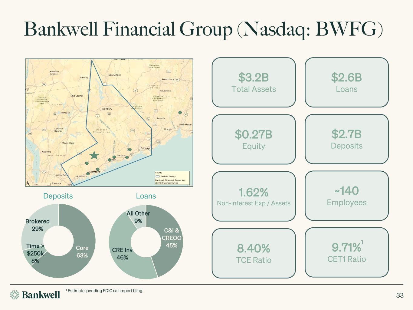 Bankwell Financial Group (Nasdaq: BWFG) $3.2B Total Assets $2.6B Loans $0.27B Equity $2.7B Deposits 1.62% Non-interest Exp / Assets ~140 Employees 8.40% TCE Ratio 9.71% CET1 Ratio C&I & CREOO 45% CRE Inv 46% All Other 9% Loans Core 63% Time > $250k 8% Brokered 29% Deposits 33 1 1 Estimate, pending FDIC call report filing.