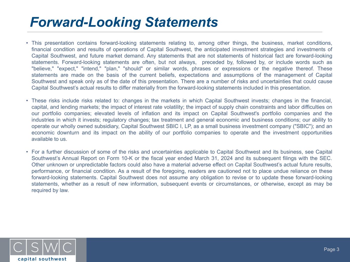 Page 3 • This presentation contains forward-looking statements relating to, among other things, the business, market conditions, financial condition and results of operations of Capital Southwest, the anticipated investment strategies and investments of Capital Southwest, and future market demand. Any statements that are not statements of historical fact are forward-looking statements. Forward-looking statements are often, but not always, preceded by, followed by, or include words such as "believe," "expect," "intend," "plan," "should" or similar words, phrases or expressions or the negative thereof. These statements are made on the basis of the current beliefs, expectations and assumptions of the management of Capital Southwest and speak only as of the date of this presentation. There are a number of risks and uncertainties that could cause Capital Southwest’s actual results to differ materially from the forward-looking statements included in this presentation. • These risks include risks related to: changes in the markets in which Capital Southwest invests; changes in the financial, capital, and lending markets; the impact of interest rate volatility; the impact of supply chain constraints and labor difficulties on our portfolio companies; elevated levels of inflation and its impact on Capital Southwest's portfolio companies and the industries in which it invests; regulatory changes; tax treatment and general economic and business conditions; our ability to operate our wholly owned subsidiary, Capital Southwest SBIC I, LP, as a small business investment company ("SBIC"); and an economic downturn and its impact on the ability of our portfolio companies to operate and the investment opportunities available to us. • For a further discussion of some of the risks and uncertainties applicable to Capital Southwest and its business, see Capital Southwest’s Annual Report on Form 10-K or the fiscal year ended March 31, 2024 and its subsequent filings with the SEC. Other unknown or unpredictable factors could also have a material adverse effect on Capital Southwest’s actual future results, performance, or financial condition. As a result of the foregoing, readers are cautioned not to place undue reliance on these forward-looking statements. Capital Southwest does not assume any obligation to revise or to update these forward-looking statements, whether as a result of new information, subsequent events or circumstances, or otherwise, except as may be required by law. Forward-Looking Statements