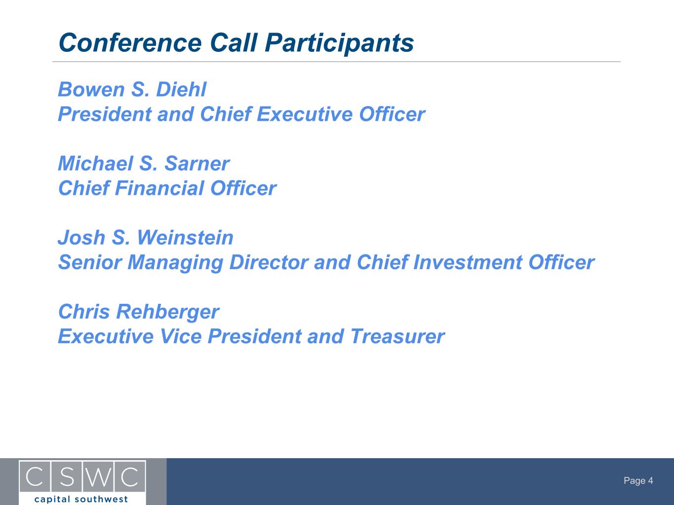 Page 4 Bowen S. Diehl President and Chief Executive Officer Michael S. Sarner Chief Financial Officer Josh S. Weinstein Senior Managing Director and Chief Investment Officer Chris Rehberger Executive Vice President and Treasurer Conference Call Participants