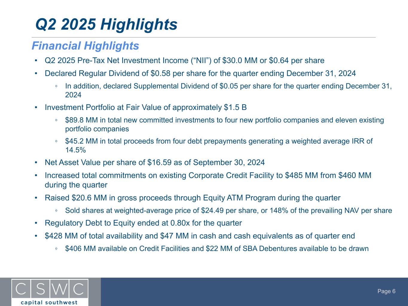In commenting on the Company’s results, Bowen Diehl, President and Chief Executive Officer, stated, “The September quarter was another strong quarter for Capital Southwest. Our portfolio continued to perform well, producing $0.64 of pre-tax net investment income per share for the quarter, which earned both our $0.58 per share regular dividend and our $0.06 per share supplemental dividend paid for the quarter. Originations for the quarter were $90 million, offset by $45 million in prepayments. Due to delayed deal closings past the end of the September quarter, as well as an exceptionally strong current backlog of deals in diligence, we expect very robust net portfolio growth for the quarter ending December 31, 2024. In consideration of the strong performance of our portfolio, the Board of Directors has again declared a regular dividend of $0.58 per share for the quarter ending December 31, 2024. Our Board of Directors has also declared a supplemental dividend of $0.05 per share for the quarter ending December 31, 2024, resulting in total dividends for the quarter ending December 31, 2024 of $0.63 per share. While future dividend declarations are at the discretion of our Board of Directors, it is our intent to continue to distribute quarterly supplemental dividends for the foreseeable future. Finally, we continued our capital raising track record during the quarter raising over $20 million on our Equity ATM Program and adding $25 million in new commitments to our Corporate Credit Facility.”