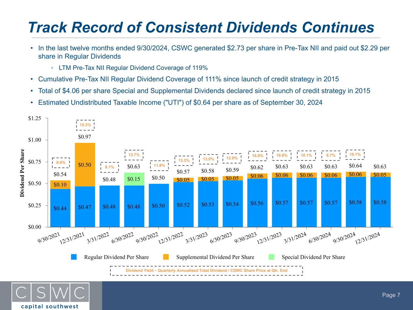 Page 6 • Q2 2025 Pre-Tax Net Investment Income (“NII”) of $30.0 MM or $0.64 per share • Declared Regular Dividend of $0.58 per share for the quarter ending December 31, 2024 ◦ In addition, declared Supplemental Dividend of $0.05 per share for the quarter ending December 31, 2024 • Investment Portfolio at Fair Value of approximately $1.5 B ◦ $89.8 MM in total new committed investments to four new portfolio companies and eleven existing portfolio companies ◦ $45.2 MM in total proceeds from four debt prepayments generating a weighted average IRR of 14.5% • Net Asset Value per share of $16.59 as of September 30, 2024 • Increased total commitments on existing Corporate Credit Facility to $485 MM from $460 MM during the quarter • Raised $20.6 MM in gross proceeds through Equity ATM Program during the quarter ◦ Sold shares at weighted-average price of $24.49 per share, or 148% of the prevailing NAV per share • Regulatory Debt to Equity ended at 0.80x for the quarter • $428 MM of total availability and $47 MM in cash and cash equivalents as of quarter end ◦ $406 MM available on Credit Facilities and $22 MM of SBA Debentures available to be drawn Q2 2025 Highlights Financial Highlights