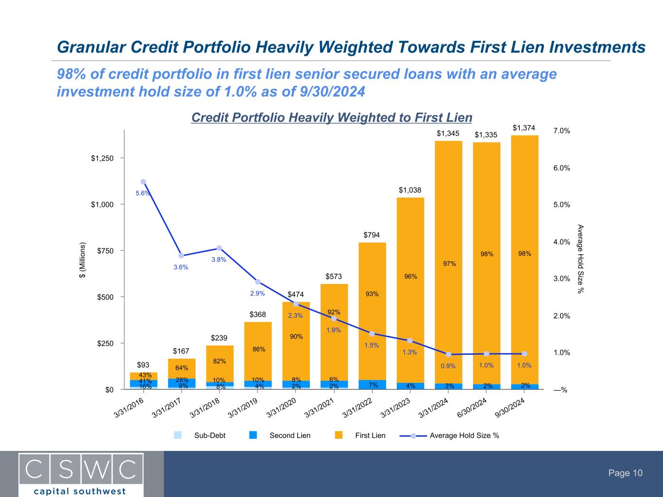 Page 9 CSWC leads financing transactions, primarily backing private equity firms that generally fit the following parameters • Flexible financing solutions to fund growth, changes of control, or other corporate events • Investments are diverse among industries, geographic regions, and end markets • Companies with EBITDA between $3 MM and $25 MM • Typical leverage of 2.5x – 4.5x Debt to EBITDA through CSWC debt position and Loan-to-Value of 25% - 50% • Investments generally range in size from $5 MM to $50 MM • Both sponsored and non-sponsored deals • Floating rate first lien debt securities • Frequently make equity co-investments alongside CSWC debt Lower Middle Market Credit Strategy