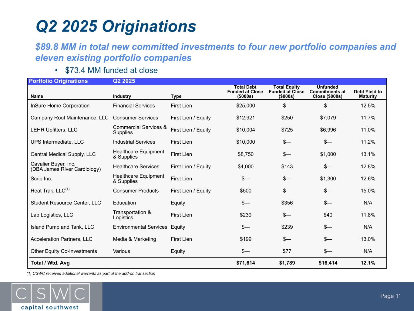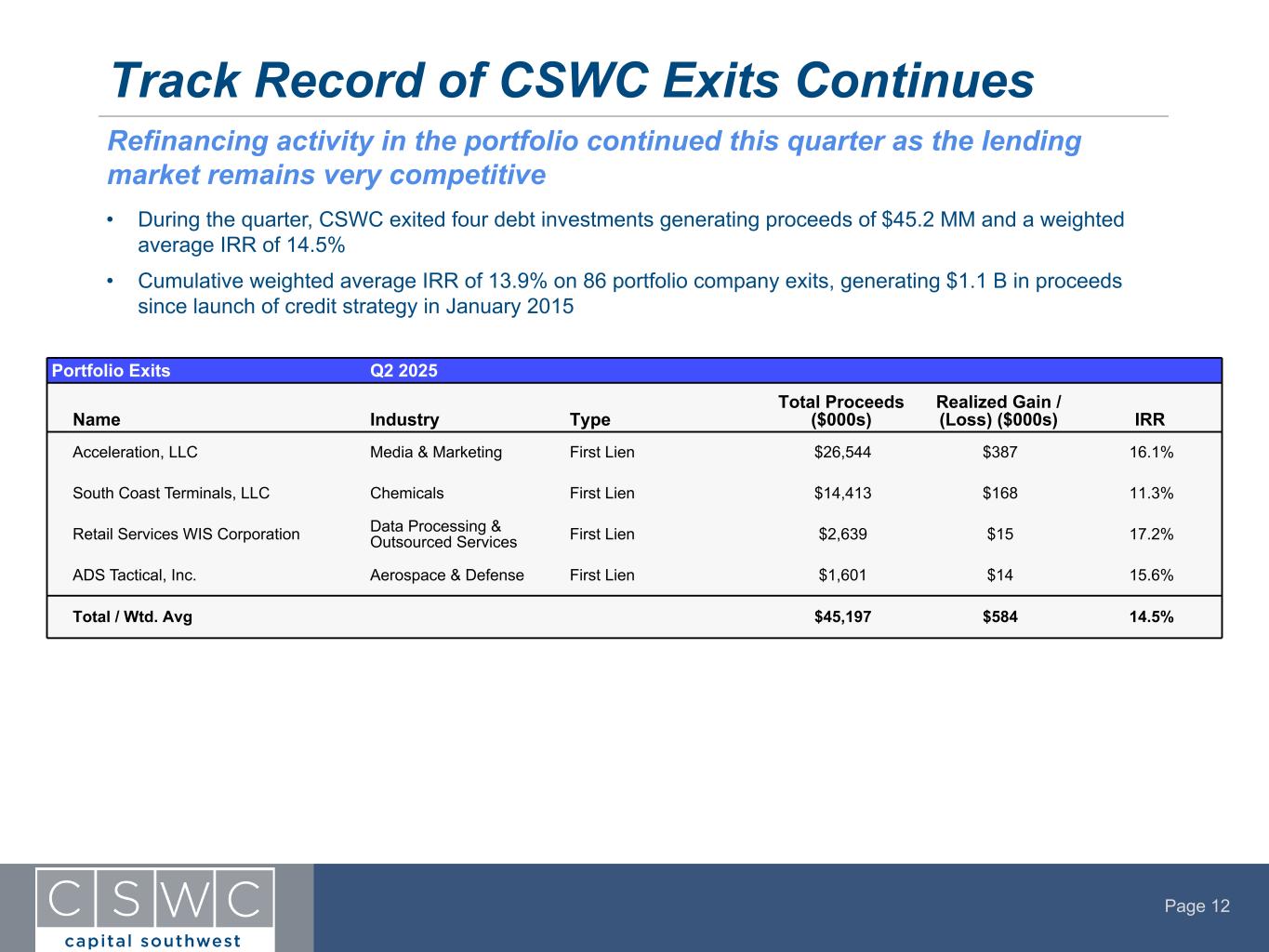 Page 11 $89.8 MM in total new committed investments to four new portfolio companies and eleven existing portfolio companies Q2 2025 Originations Portfolio Originations Q2 2025 Name Industry Type Total Debt Funded at Close ($000s) Total Equity Funded at Close ($000s) Unfunded Commitments at Close ($000s) Debt Yield to Maturity InSure Home Corporation Financial Services First Lien $25,000 $— $— 12.5% Campany Roof Maintenance, LLC Consumer Services First Lien / Equity $12,921 $250 $7,079 11.7% LEHR Upfitters, LLC Commercial Services & Supplies First Lien / Equity $10,004 $725 $6,996 11.0% UPS Intermediate, LLC Industrial Services First Lien $10,000 $— $— 11.2% Central Medical Supply, LLC Healthcare Equipment & Supplies First Lien $8,750 $— $1,000 13.1% Cavalier Buyer, Inc. (DBA James River Cardiology) Healthcare Services First Lien / Equity $4,000 $143 $— 12.8% Scrip Inc. Healthcare Equipment & Supplies First Lien $— $— $1,300 12.6% Heat Trak, LLC(1) Consumer Products First Lien / Equity $500 $— $— 15.0% Student Resource Center, LLC Education Equity $— $356 $— N/A Lab Logistics, LLC Transportation & Logistics First Lien $239 $— $40 11.8% Island Pump and Tank, LLC Environmental Services Equity $— $239 $— N/A Acceleration Partners, LLC Media & Marketing First Lien $199 $— $— 13.0% Other Equity Co-Investments Various Equity $— $77 $— N/A Total / Wtd. Avg $71,614 $1,789 $16,414 12.1% • $73.4 MM funded at close (1) CSWC received additional warrants as part of the add-on transaction