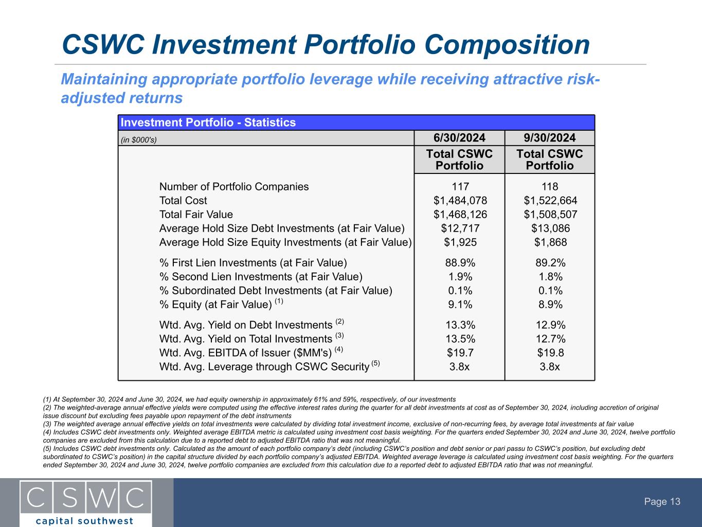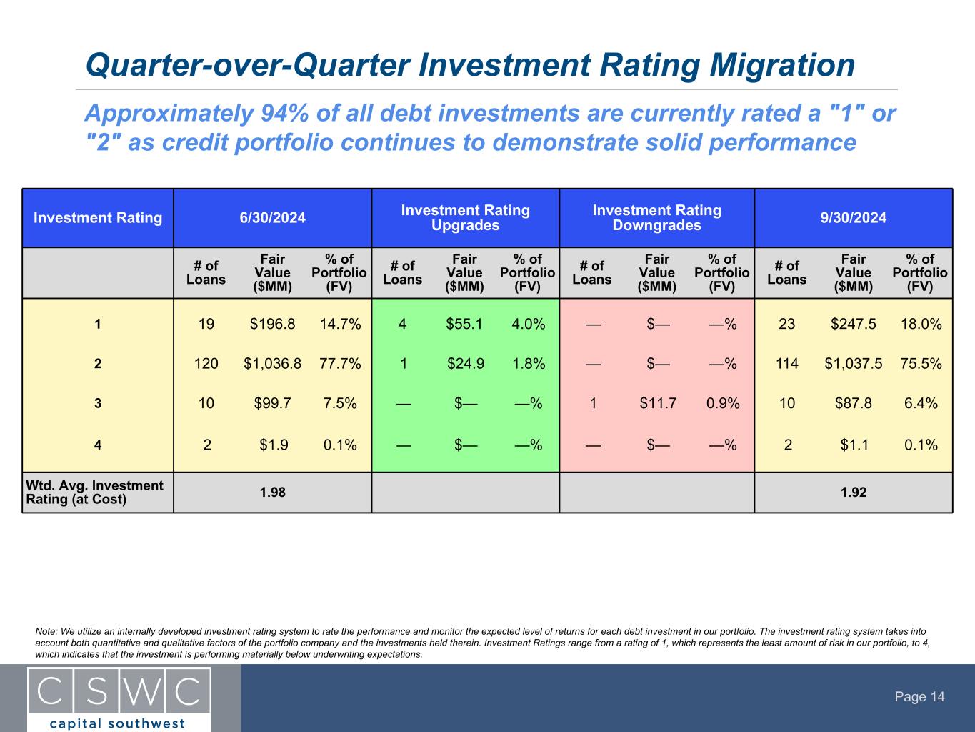 Page 13 CSWC Investment Portfolio Composition (1) At September 30, 2024 and June 30, 2024, we had equity ownership in approximately 61% and 59%, respectively, of our investments (2) The weighted-average annual effective yields were computed using the effective interest rates during the quarter for all debt investments at cost as of September 30, 2024, including accretion of original issue discount but excluding fees payable upon repayment of the debt instruments (3) The weighted average annual effective yields on total investments were calculated by dividing total investment income, exclusive of non-recurring fees, by average total investments at fair value (4) Includes CSWC debt investments only. Weighted average EBITDA metric is calculated using investment cost basis weighting. For the quarters ended September 30, 2024 and June 30, 2024, twelve portfolio companies are excluded from this calculation due to a reported debt to adjusted EBITDA ratio that was not meaningful. (5) Includes CSWC debt investments only. Calculated as the amount of each portfolio company’s debt (including CSWC’s position and debt senior or pari passu to CSWC’s position, but excluding debt subordinated to CSWC’s position) in the capital structure divided by each portfolio company’s adjusted EBITDA. Weighted average leverage is calculated using investment cost basis weighting. For the quarters ended September 30, 2024 and June 30, 2024, twelve portfolio companies are excluded from this calculation due to a reported debt to adjusted EBITDA ratio that was not meaningful. Maintaining appropriate portfolio leverage while receiving attractive risk- adjusted returns Investment Portfolio - Statistics (in $000's) 6/30/2024 9/30/2024 Total CSWC Portfolio Total CSWC Portfolio Number of Portfolio Companies 117 118 Total Cost $1,484,078 $1,522,664 Total Fair Value $1,468,126 $1,508,507 Average Hold Size Debt Investments (at Fair Value) $12,717 $13,086 Average Hold Size Equity Investments (at Fair Value) $1,925 $1,868 % First Lien Investments (at Fair Value) 88.9% 89.2% % Second Lien Investments (at Fair Value) 1.9% 1.8% % Subordinated Debt Investments (at Fair Value) 0.1% 0.1% % Equity (at Fair Value) (1) 9.1% 8.9% Wtd. Avg. Yield on Debt Investments (2) 13.3% 12.9% Wtd. Avg. Yield on Total Investments (3) 13.5% 12.7% Wtd. Avg. EBITDA of Issuer ($MM's) (4) $19.7 $19.8 Wtd. Avg. Leverage through CSWC Security (5) 3.8x 3.8x