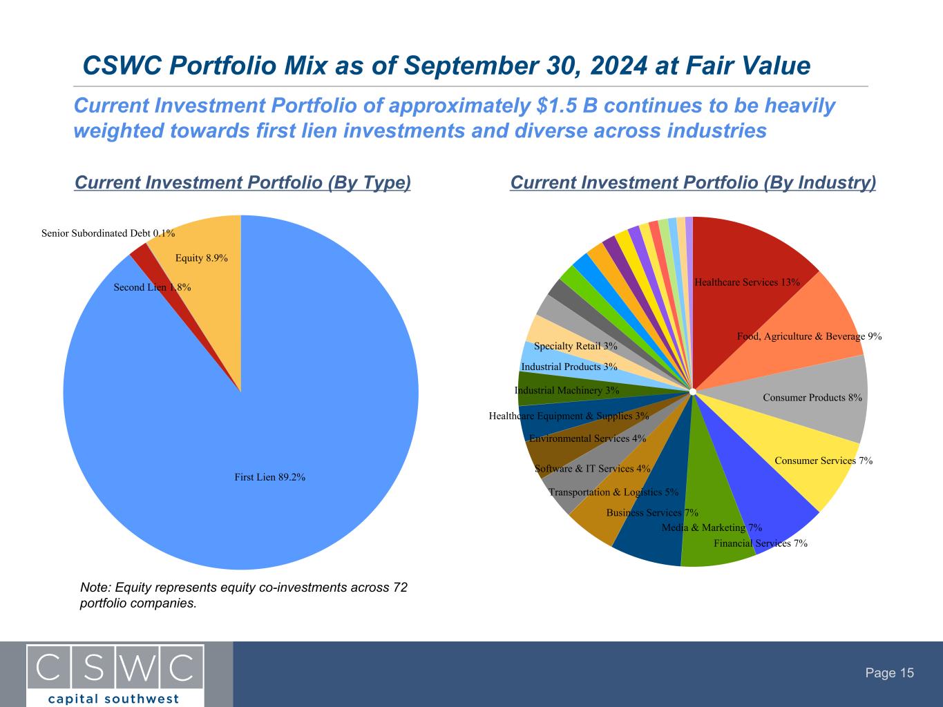 Page 14 Approximately 94% of all debt investments are currently rated a "1" or "2" as credit portfolio continues to demonstrate solid performance Investment Rating 6/30/2024 Investment Rating Upgrades Investment Rating Downgrades 9/30/2024 # of Loans Fair Value ($MM) % of Portfolio (FV) # of Loans Fair Value ($MM) % of Portfolio (FV) # of Loans Fair Value ($MM) % of Portfolio (FV) # of Loans Fair Value ($MM) % of Portfolio (FV) 1 19 $196.8 14.7% 4 $55.1 4.0% — $— —% 23 $247.5 18.0% 2 120 $1,036.8 77.7% 1 $24.9 1.8% — $— —% 114 $1,037.5 75.5% 3 10 $99.7 7.5% — $— —% 1 $11.7 0.9% 10 $87.8 6.4% 4 2 $1.9 0.1% — $— —% — $— —% 2 $1.1 0.1% Wtd. Avg. Investment Rating (at Cost) 1.98 1.92 Quarter-over-Quarter Investment Rating Migration Note: We utilize an internally developed investment rating system to rate the performance and monitor the expected level of returns for each debt investment in our portfolio. The investment rating system takes into account both quantitative and qualitative factors of the portfolio company and the investments held therein. Investment Ratings range from a rating of 1, which represents the least amount of risk in our portfolio, to 4, which indicates that the investment is performing materially below underwriting expectations.