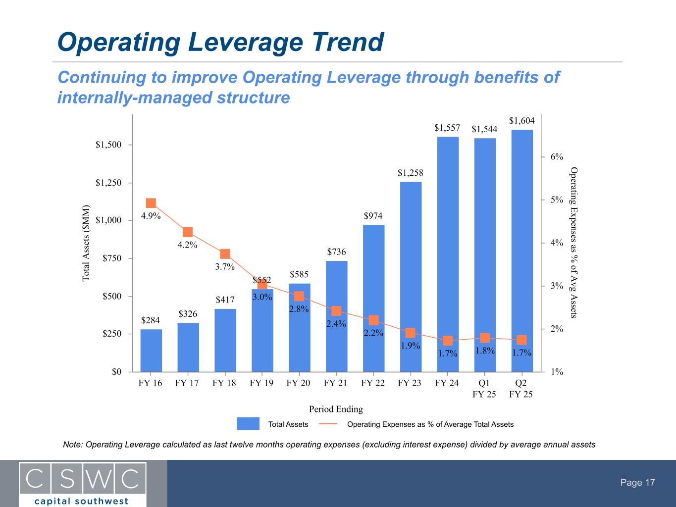Page 17 Operating Leverage Trend Continuing to improve Operating Leverage through benefits of internally-managed structure Period Ending To ta l A ss et s ( $M M ) O perating Expenses as % of A vg A ssets $284 $326 $417 $552 $585 $736 $974 $1,258 $1,557 $1,544 $1,604 4.9% 4.2% 3.7% 3.0% 2.8% 2.4% 2.2% 1.9% 1.7% 1.8% 1.7% FY 16 FY 17 FY 18 FY 19 FY 20 FY 21 FY 22 FY 23 FY 24 Q1 FY 25 Q2 FY 25 $0 $250 $500 $750 $1,000 $1,250 $1,500 1% 2% 3% 4% 5% 6% Total Assets Operating Expenses as % of Average Total Assets Note: Operating Leverage calculated as last twelve months operating expenses (excluding interest expense) divided by average annual assets