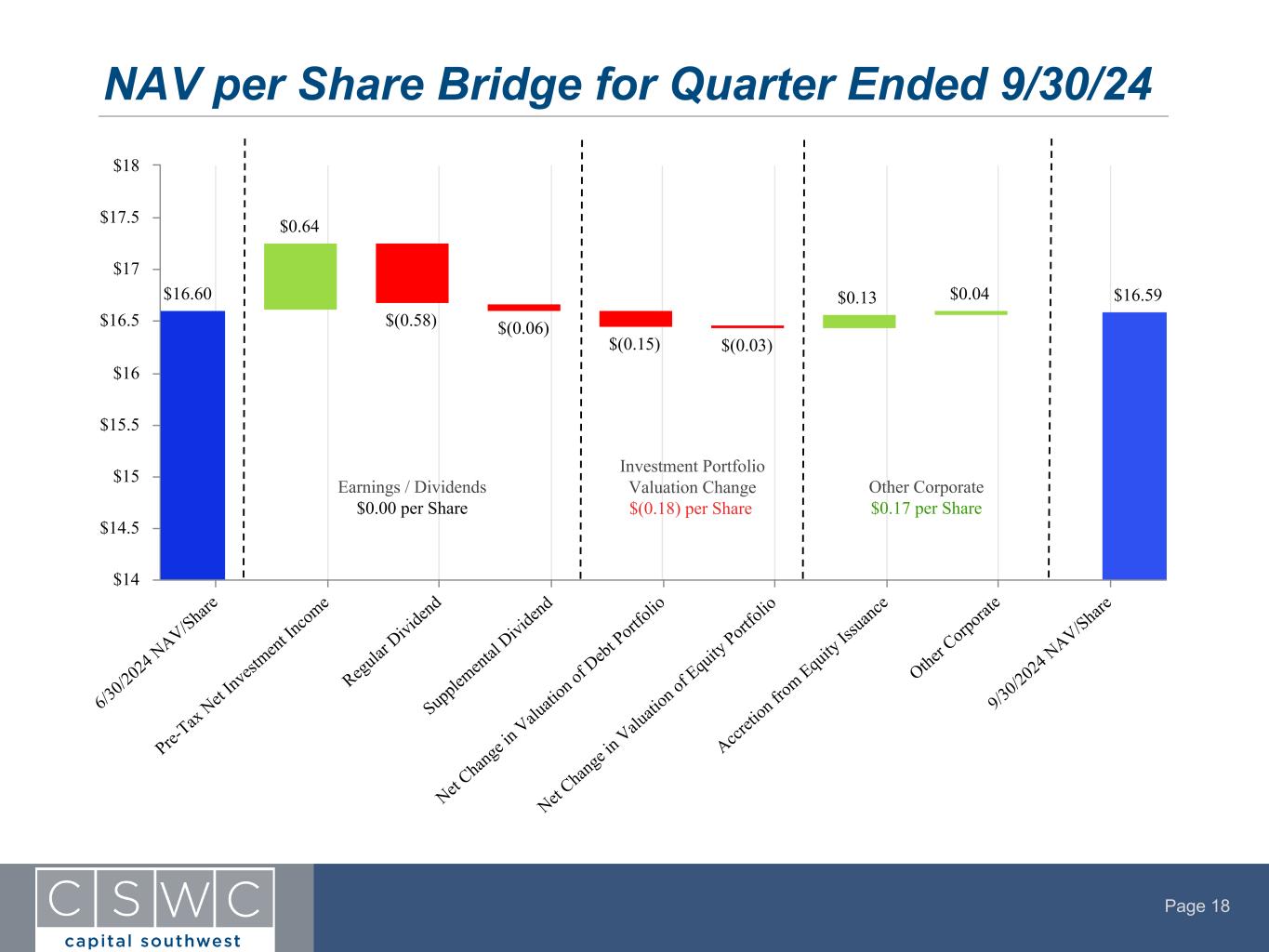 The Company’s NAV at September 30, 2024 was $16.59 per share, as compared to $16.60 the prior quarter. The decrease in NAV per share from the prior quarter is primarily due to net realized and unrealized losses on investments, partially offset by the issuance of common stock at a premium to NAV per share through the Equity ATM Program (as described below).