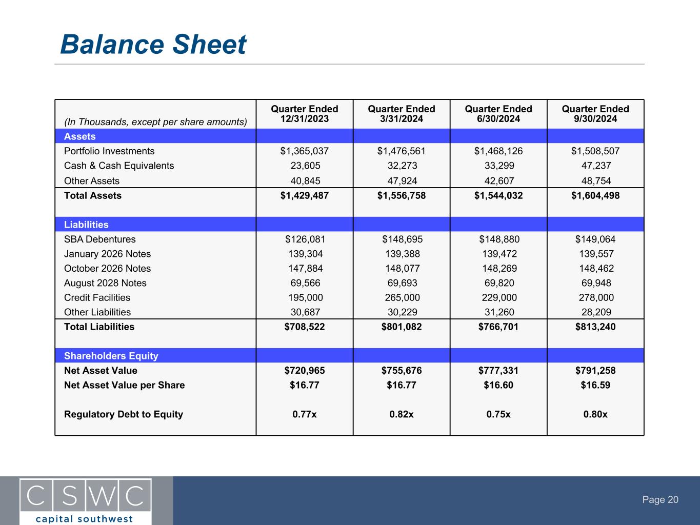 Page 20 Balance Sheet (In Thousands, except per share amounts) Quarter Ended 12/31/2023 Quarter Ended 3/31/2024 Quarter Ended 6/30/2024 Quarter Ended 9/30/2024 Assets Portfolio Investments $1,365,037 $1,476,561 $1,468,126 $1,508,507 Cash & Cash Equivalents 23,605 32,273 33,299 47,237 Other Assets 40,845 47,924 42,607 48,754 Total Assets $1,429,487 $1,556,758 $1,544,032 $1,604,498 Liabilities SBA Debentures $126,081 $148,695 $148,880 $149,064 January 2026 Notes 139,304 139,388 139,472 139,557 October 2026 Notes 147,884 148,077 148,269 148,462 August 2028 Notes 69,566 69,693 69,820 69,948 Credit Facilities 195,000 265,000 229,000 278,000 Other Liabilities 30,687 30,229 31,260 28,209 Total Liabilities $708,522 $801,082 $766,701 $813,240 Shareholders Equity Net Asset Value $720,965 $755,676 $777,331 $791,258 Net Asset Value per Share $16.77 $16.77 $16.60 $16.59 Regulatory Debt to Equity 0.77x 0.82x 0.75x 0.80x