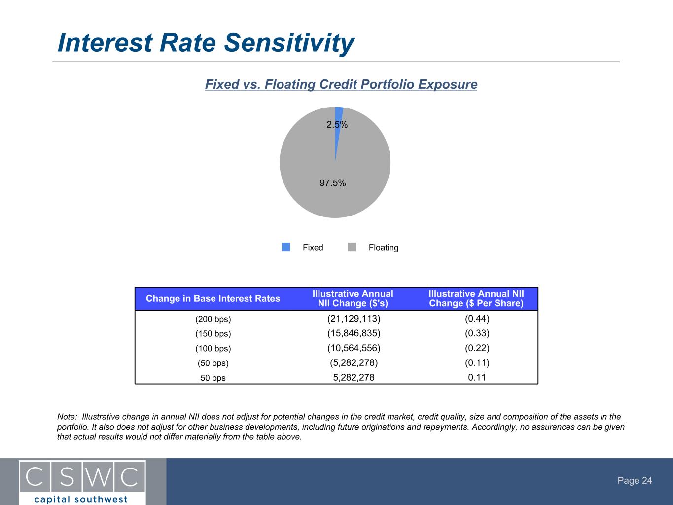 Page 24 Note: Illustrative change in annual NII does not adjust for potential changes in the credit market, credit quality, size and composition of the assets in the portfolio. It also does not adjust for other business developments, including future originations and repayments. Accordingly, no assurances can be given that actual results would not differ materially from the table above. Interest Rate Sensitivity Fixed vs. Floating Credit Portfolio Exposure Change in Base Interest Rates Illustrative Annual NII Change ($'s) Illustrative Annual NII Change ($ Per Share) (200 bps) (21,129,113) (0.44) (150 bps) (15,846,835) (0.33) (100 bps) (10,564,556) (0.22) (50 bps) (5,282,278) (0.11) 50 bps 5,282,278 0.11 2.5% 97.5% Fixed Floating