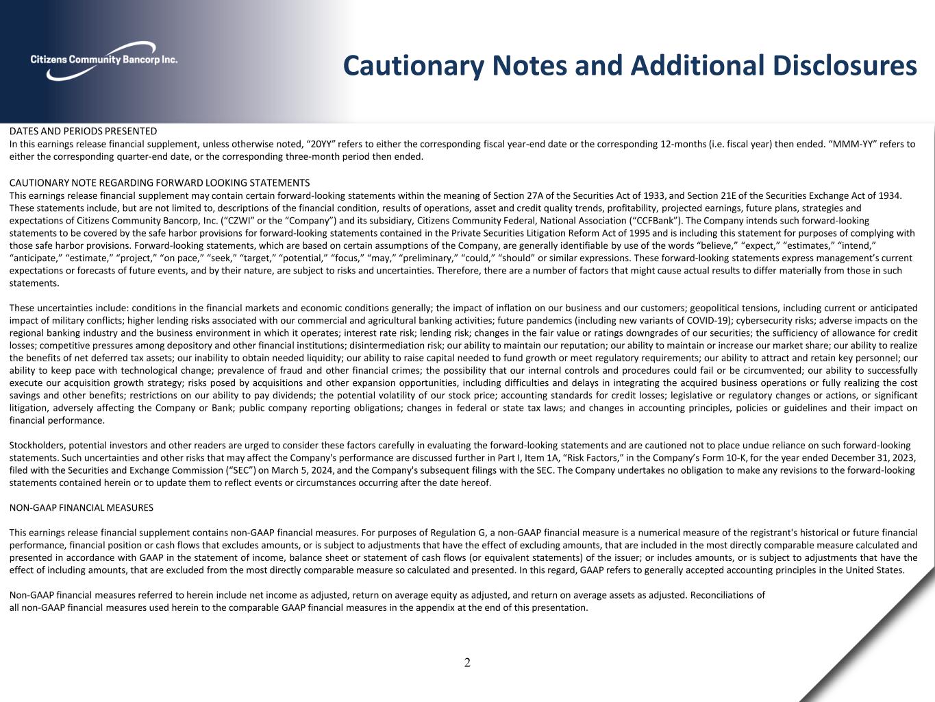 Cautionary Notes and Additional Disclosures DATES AND PERIODS PRESENTED In this earnings release financial supplement, unless otherwise noted, “20YY” refers to either the corresponding fiscal year-end date or the corresponding 12-months (i.e. fiscal year) then ended. “MMM-YY” refers to either the corresponding quarter-end date, or the corresponding three-month period then ended. CAUTIONARY NOTE REGARDING FORWARD LOOKING STATEMENTS This earnings release financial supplement may contain certain forward-looking statements within the meaning of Section 27A of the Securities Act of 1933, and Section 21E of the Securities Exchange Act of 1934. These statements include, but are not limited to, descriptions of the financial condition, results of operations, asset and credit quality trends, profitability, projected earnings, future plans, strategies and expectations of Citizens Community Bancorp, Inc. (“CZWI” or the “Company”) and its subsidiary, Citizens Community Federal, National Association (“CCFBank”). The Company intends such forward-looking statements to be covered by the safe harbor provisions for forward-looking statements contained in the Private Securities Litigation Reform Act of 1995 and is including this statement for purposes of complying with those safe harbor provisions. Forward-looking statements, which are based on certain assumptions of the Company, are generally identifiable by use of the words “believe,” “expect,” “estimates,” “intend,” “anticipate,” “estimate,” “project,” “on pace,” “seek,” “target,” “potential,” “focus,” “may,” “preliminary,” “could,” “should” or similar expressions. These forward-looking statements express management’s current expectations or forecasts of future events, and by their nature, are subject to risks and uncertainties. Therefore, there are a number of factors that might cause actual results to differ materially from those in such statements. These uncertainties include: conditions in the financial markets and economic conditions generally; the impact of inflation on our business and our customers; geopolitical tensions, including current or anticipated impact of military conflicts; higher lending risks associated with our commercial and agricultural banking activities; future pandemics (including new variants of COVID-19); cybersecurity risks; adverse impacts on the regional banking industry and the business environment in which it operates; interest rate risk; lending risk; changes in the fair value or ratings downgrades of our securities; the sufficiency of allowance for credit losses; competitive pressures among depository and other financial institutions; disintermediation risk; our ability to maintain our reputation; our ability to maintain or increase our market share; our ability to realize the benefits of net deferred tax assets; our inability to obtain needed liquidity; our ability to raise capital needed to fund growth or meet regulatory requirements; our ability to attract and retain key personnel; our ability to keep pace with technological change; prevalence of fraud and other financial crimes; the possibility that our internal controls and procedures could fail or be circumvented; our ability to successfully execute our acquisition growth strategy; risks posed by acquisitions and other expansion opportunities, including difficulties and delays in integrating the acquired business operations or fully realizing the cost savings and other benefits; restrictions on our ability to pay dividends; the potential volatility of our stock price; accounting standards for credit losses; legislative or regulatory changes or actions, or significant litigation, adversely affecting the Company or Bank; public company reporting obligations; changes in federal or state tax laws; and changes in accounting principles, policies or guidelines and their impact on financial performance. Stockholders, potential investors and other readers are urged to consider these factors carefully in evaluating the forward-looking statements and are cautioned not to place undue reliance on such forward-looking statements. Such uncertainties and other risks that may affect the Company's performance are discussed further in Part I, Item 1A, “Risk Factors,” in the Company’s Form 10-K, for the year ended December 31, 2023, filed with the Securities and Exchange Commission (“SEC”) on March 5, 2024, and the Company's subsequent filings with the SEC. The Company undertakes no obligation to make any revisions to the forward-looking statements contained herein or to update them to reflect events or circumstances occurring after the date hereof. NON-GAAP FINANCIAL MEASURES This earnings release financial supplement contains non-GAAP financial measures. For purposes of Regulation G, a non-GAAP financial measure is a numerical measure of the registrant's historical or future financial performance, financial position or cash flows that excludes amounts, or is subject to adjustments that have the effect of excluding amounts, that are included in the most directly comparable measure calculated and presented in accordance with GAAP in the statement of income, balance sheet or statement of cash flows (or equivalent statements) of the issuer; or includes amounts, or is subject to adjustments that have the effect of including amounts, that are excluded from the most directly comparable measure so calculated and presented. In this regard, GAAP refers to generally accepted accounting principles in the United States. Non-GAAP financial measures referred to herein include net income as adjusted, return on average equity as adjusted, and return on average assets as adjusted. Reconciliations of all non-GAAP financial measures used herein to the comparable GAAP financial measures in the appendix at the end of this presentation. 2