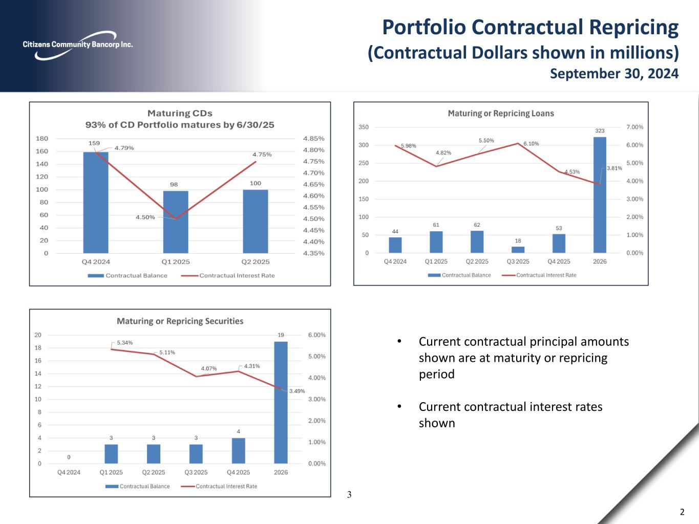 2 Portfolio Contractual Repricing (Contractual Dollars shown in millions) September 30, 2024 • Current contractual principal amounts shown are at maturity or repricing period • Current contractual interest rates shown 3
