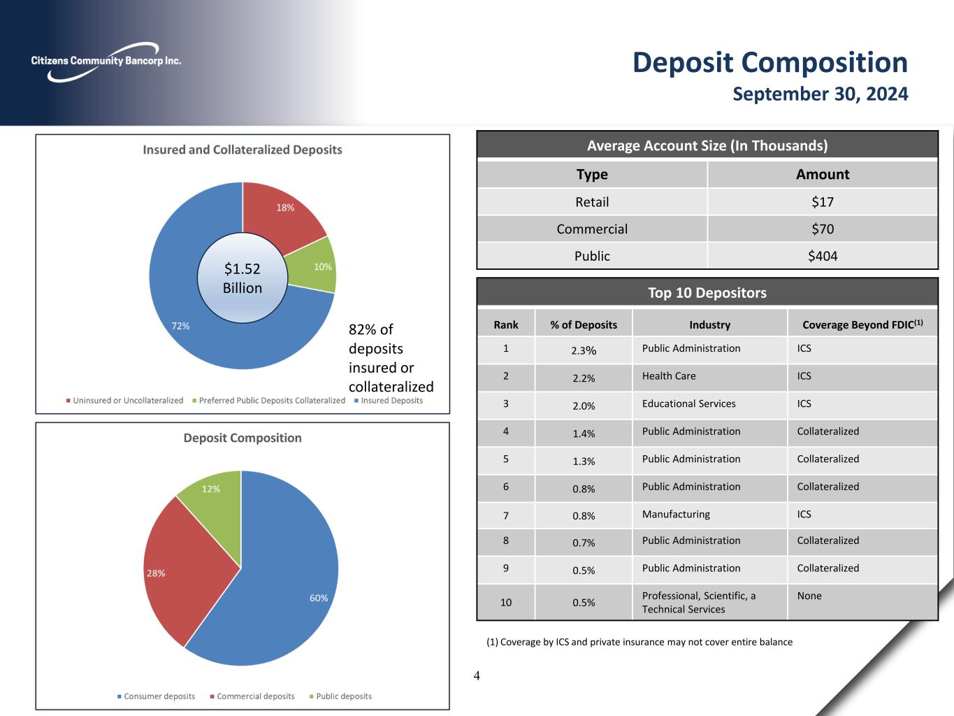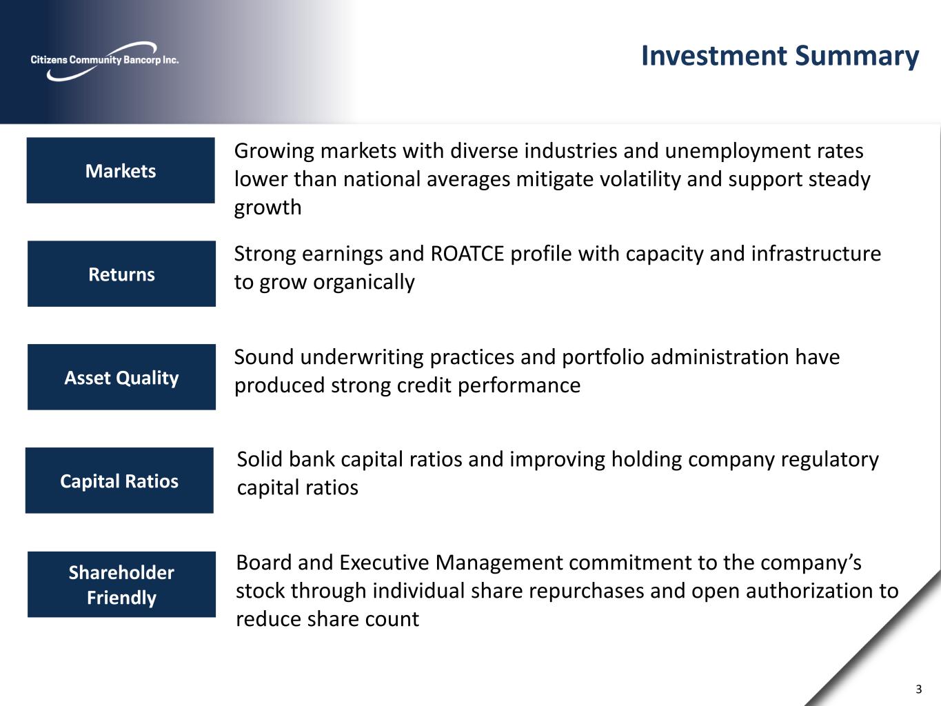 Cautionary Notes and Additional Disclosures 2 DATES AND PERIODS PRESENTED Unless otherwise noted, “20YY” refers to either the corresponding fiscal year-end date or the corresponding 12-months (i.e., fiscal year) then ended. “MMM-YY” refers to either the corresponding quarter-end date, or the corresponding three-month period then ended. CAUTIONARY NOTE REGARDING FORWARD LOOKING STATEMENTS This presentation may contain certain forward-looking statements within the meaning of Section 27A of the Securities Act of 1933, and Section 21E of the Securities Exchange Act of 1934. These statements include, but are not limited to, descriptions of the financial condition, results of operations, asset and credit quality trends, profitability, projected earnings, future plans, strategies and expectations of Citizens Community Bancorp, Inc. (“CZWI” or the “Company”) and its subsidiary, Citizens Community Federal, National Association (“CCFBank”) . The Company intends such forward-looking statements to be covered by the safe harbor provisions for forward-looking statements contained in the Private Securities Litigation Reform Act of 1995 and is including this statement for purposes of complying with those safe harbor provisions. Forward- looking statements, which are based on certain assumptions of the Company, are generally identifiable by use of the words “believe,” “expect,” “estimates,” “intend,” “anticipate,” “estimate,” “project,” “on pace,” “seek,” “target,” “potential,” “focus,” “may,” “preliminary,” “could,” “should” or similar expressions. These forward-looking statements express management’s current expectations or forecasts of future events, and by their nature, are subject to risks and uncertainties. Therefore, there are a number of factors that might cause actual results to differ materially from those in such statements. These uncertainties include: conditions in the financial markets and economic conditions generally; the impact of inflation on our business and our customers; geopolitical tensions, including current or anticipated impact of military conflicts; higher lending risks associated with our commercial and agricultural banking activities; future pandemics (including new variants of COVID-19); cybersecurity risks; adverse impacts on the regional banking industry and the business environment in which it operates; interest rate risk; lending risk; changes in the fair value or ratings downgrades of our securities; the sufficiency of allowance for credit losses; competitive pressures among depository and other financial institutions; disintermediation risk; our ability to maintain our reputation; our ability to maintain or increase our market share; our ability to realize the benefits of net deferred tax assets; our inability to obtain needed liquidity; our ability to raise capital needed to fund growth or meet regulatory requirements; our ability to attract and retain key personnel; our ability to keep pace with technological change; prevalence of fraud and other financial crimes; the possibility that our internal controls and procedures could fail or be circumvented; our ability to successfully execute our acquisition growth strategy; risks posed by acquisitions and other expansion opportunities, including difficulties and delays in integrating the acquired business operations or fully realizing the cost savings and other benefits; restrictions on our ability to pay dividends; the potential volatility of our stock price; accounting standards for credit losses; legislative or regulatory changes or actions, or significant litigation, adversely affecting the Company or Bank; public company reporting obligations; changes in federal or state tax laws; and changes in accounting principles, policies or guidelines and their impact on financial performance. Stockholders, potential investors and other readers are urged to consider these factors carefully in evaluating the forward-looking statements and are cautioned not to place undue reliance on such forward-looking statements. Such uncertainties and other risks that may affect the Company's performance are discussed further in Part I, Item 1A, "Risk Factors," in the Company's Form 10-K, for the year ended December 31, 2023, filed with the Securities and Exchange Commission ("SEC") on March 5, 2024, and the Company's subsequent filings with the SEC. The Company undertakes no obligation to make any revisions to the forward-looking statements contained herein or to update them to reflect events or circumstances occurring after the date hereof. NON-GAAP FINANCIAL MEASURES These slides contain non-GAAP financial measures. For purposes of Regulation G, a non-GAAP financial measure is a numerical measure of the registrant's historical or future financial performance, financial position or cash flows that excludes amounts, or is subject to adjustments that have the effect of excluding amounts, that are included in the most directly comparable measure calculated and presented in accordance with GAAP in the statement of income, balance sheet or statement of cash flows (or equivalent statements) of the issuer; or includes amounts, or is subject to adjustments that have the effect of including amounts, that are excluded from the most directly comparable measure so calculated and presented. In this regard, GAAP refers to generally accepted accounting principles in the United States. Non·GAAP financial measures referred to herein include net income as adjusted, EPS as adjusted, ROAA as adjusted, return on average tangible common equity (ROATCE), ROATCE as adjusted, tangible book value, tangible book value per share, efficiency ratio as adjusted and tangible common equity / tangible assets. Reconciliations of all Non·GAAP financial measures used herein to the comparable GAAP financial measures in the appendix at the end of this presentation. SOURCE Unless otherwise not