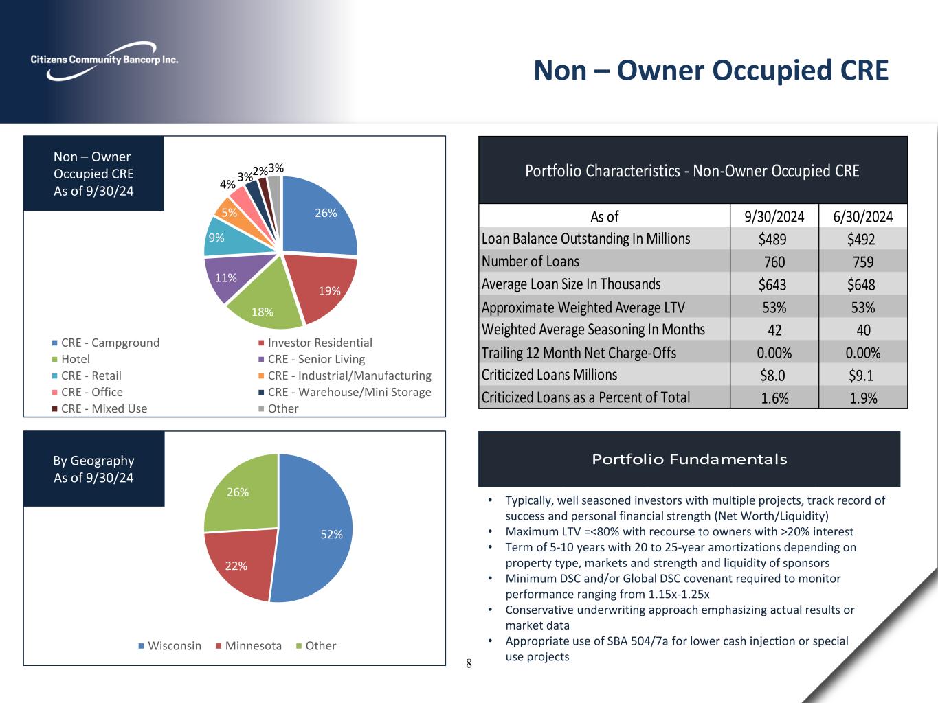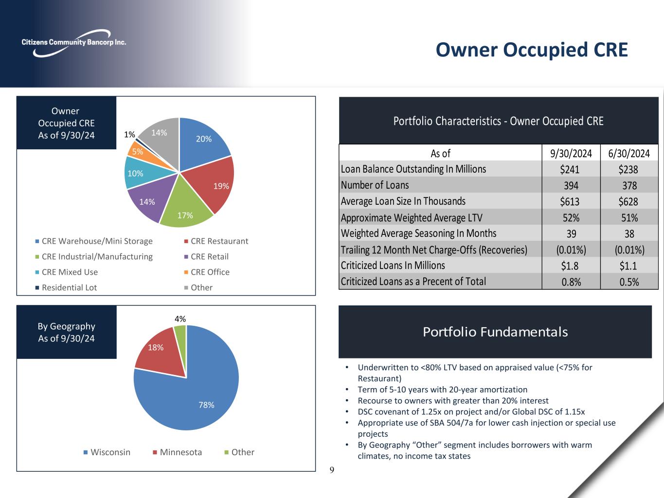 Portfolio Fundamentals 52% 22% 26% Wisconsin Minnesota Other By Geography As of 9/30/24 • Typically, well seasoned investors with multiple projects, track record of success and personal financial strength (Net Worth/Liquidity) • Maximum LTV =<80% with recourse to owners with >20% interest • Term of 5-10 years with 20 to 25-year amortizations depending on property type, markets and strength and liquidity of sponsors • Minimum DSC and/or Global DSC covenant required to monitor performance ranging from 1.15x-1.25x • Conservative underwriting approach emphasizing actual results or market data • Appropriate use of SBA 504/7a for lower cash injection or special use projects Non – Owner Occupied CRE 9/30/2024 6/30/2024 $489 $492 760 759 $643 $648 Approximate Weighted Average LTV 53% 53% 42 40 Trailing 12 Month Net Charge-Offs 0.00% 0.00% $8.0 $9.1 1.6% 1.9% Weighted Average Seasoning In Months Loan Balance Outstanding In Millions Number of Loans Average Loan Size In Thousands Portfolio Characteristics - Non-Owner Occupied CRE As of Criticized Loans Millions Criticized Loans as a Percent of Total 26% 19% 18% 11% 9% 5% 4% 3%2%3% CRE - Campground Investor Residential Hotel CRE - Senior Living CRE - Retail CRE - Industrial/Manufacturing CRE - Office CRE - Warehouse/Mini Storage CRE - Mixed Use Other Non – Owner Occupied CRE As of 9/30/24 8