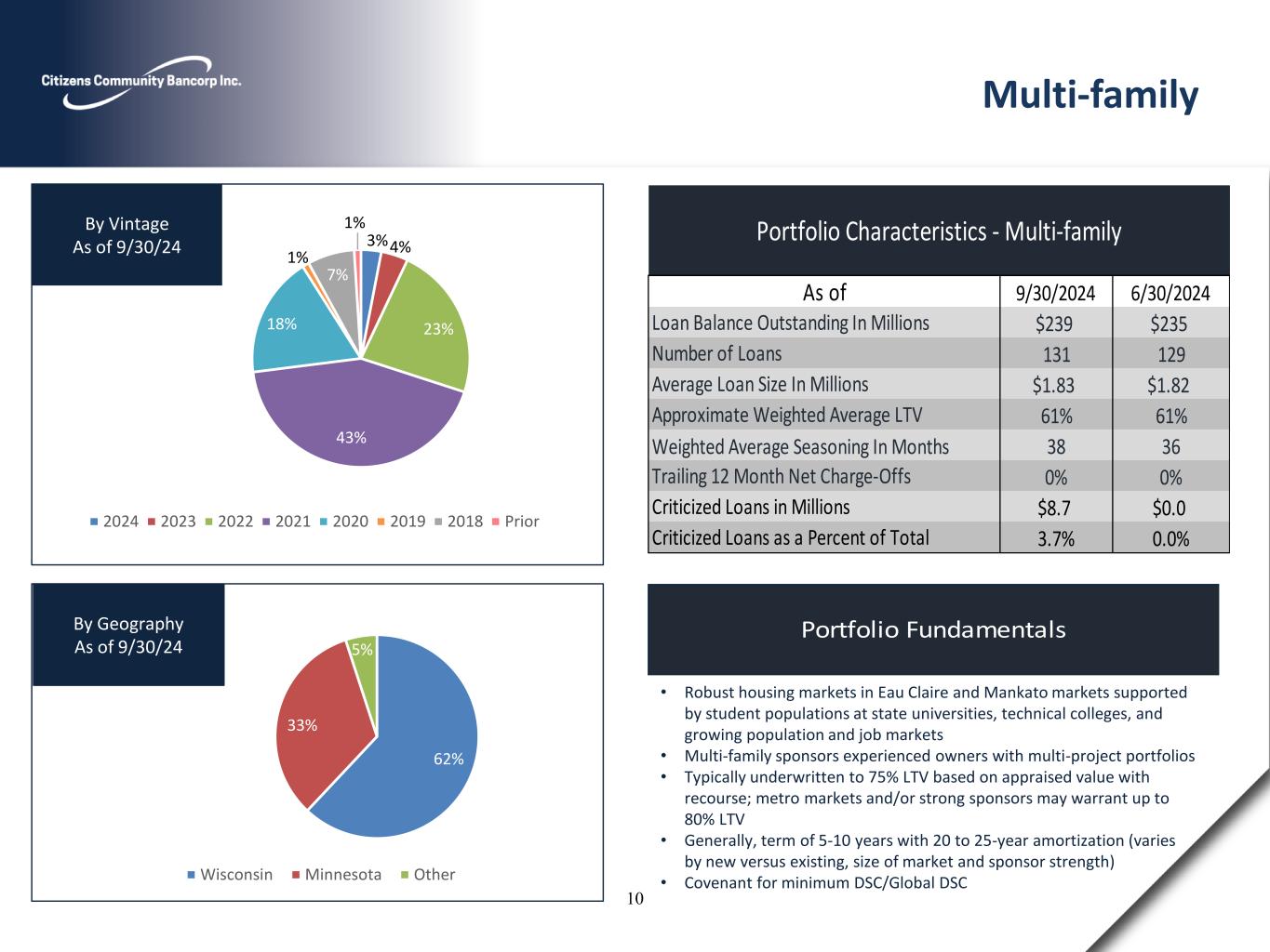 Portfolio Fundamentals 62% 33% 5% Wisconsin Minnesota Other By Geography As of 9/30/24 3%4% 23% 43% 18% 1% 7% 1% 2024 2023 2022 2021 2020 2019 2018 Prior By Vintage As of 9/30/24 • Robust housing markets in Eau Claire and Mankato markets supported by student populations at state universities, technical colleges, and growing population and job markets • Multi-family sponsors experienced owners with multi-project portfolios • Typically underwritten to 75% LTV based on appraised value with recourse; metro markets and/or strong sponsors may warrant up to 80% LTV • Generally, term of 5-10 years with 20 to 25-year amortization (varies by new versus existing, size of market and sponsor strength) • Covenant for minimum DSC/Global DSC Multi-family 9/30/2024 6/30/2024 $239 $235 131 129 $1.83 $1.82 61% 61% Weighted Average Seasoning In Months 38 36 0% 0% $8.7 $0.0 3.7% 0.0%Criticized Loans as a Percent of Total Approximate Weighted Average LTV Trailing 12 Month Net Charge-Offs Criticized Loans in Millions Portfolio Characteristics - Multi-family Loan Balance Outstanding In Millions Number of Loans Average Loan Size In Millions As of 10