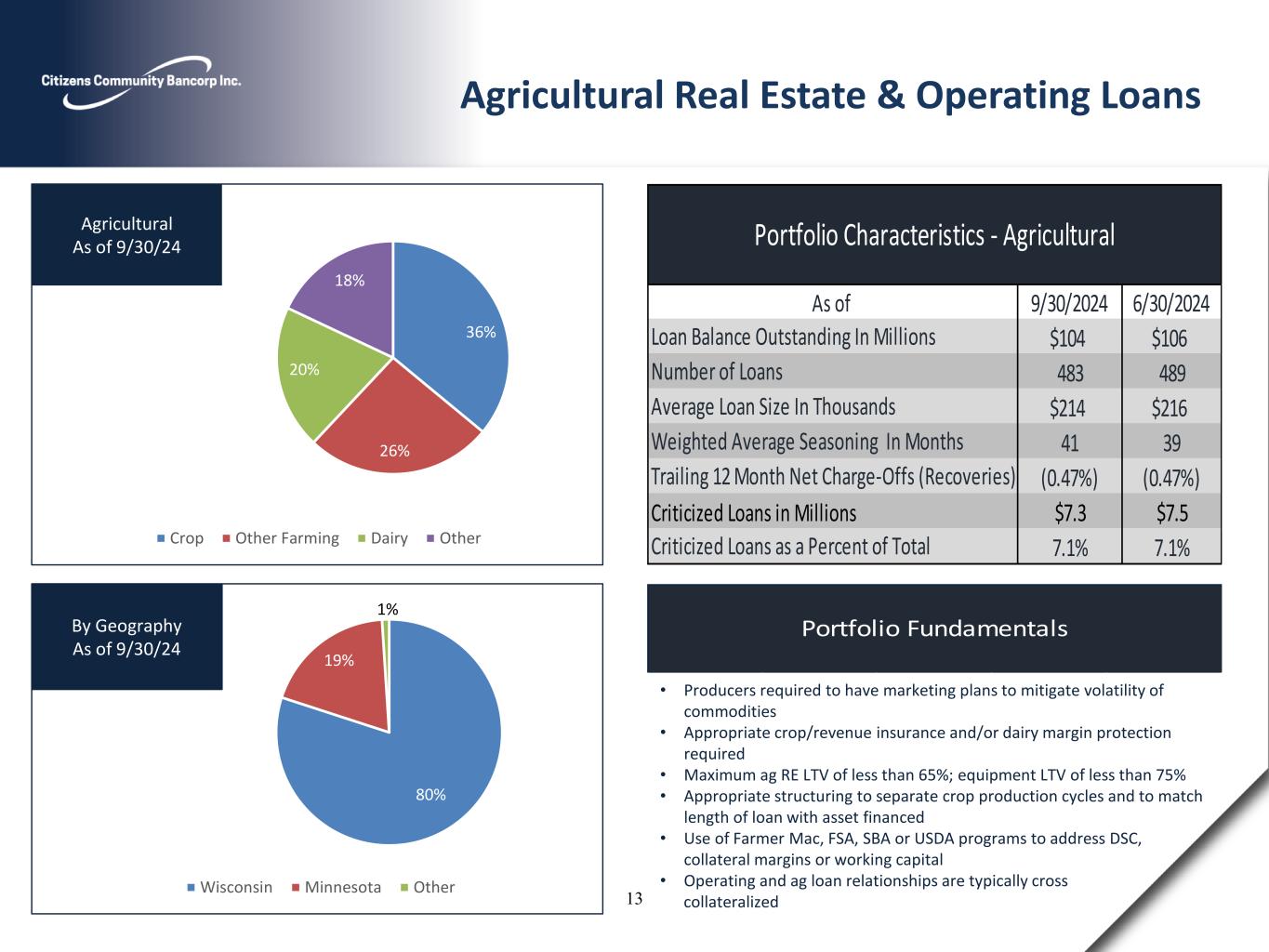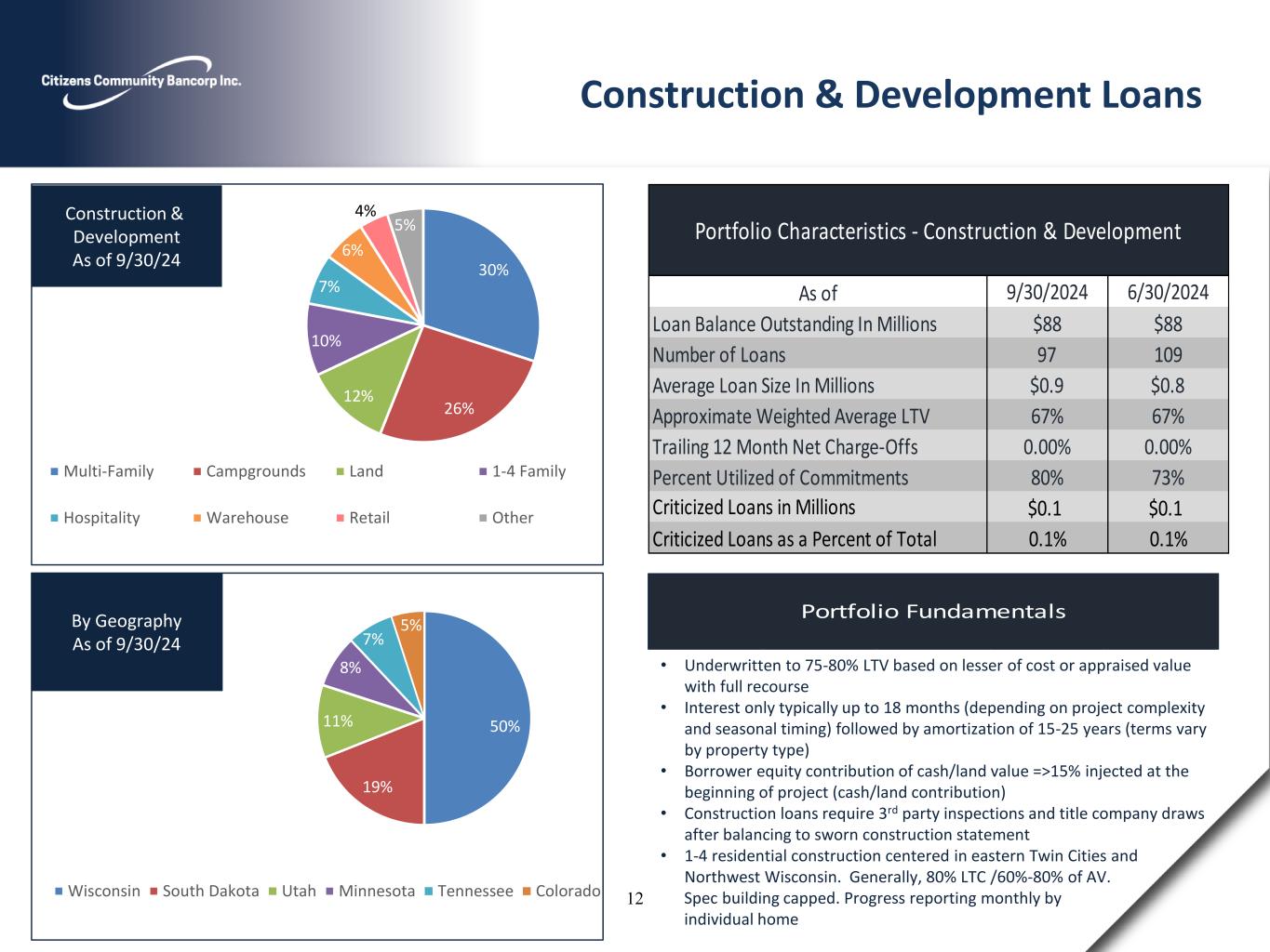 Portfolio Fundamentals 30% 26% 12% 10% 7% 6% 4% 5% Multi-Family Campgrounds Land 1-4 Family Hospitality Warehouse Retail Other Construction & Development As of 9/30/24 50% 19% 11% 8% 7% 5% Wisconsin South Dakota Utah Minnesota Tennessee Colorado By Geography As of 9/30/24 • Underwritten to 75-80% LTV based on lesser of cost or appraised value with full recourse • Interest only typically up to 18 months (depending on project complexity and seasonal timing) followed by amortization of 15-25 years (terms vary by property type) • Borrower equity contribution of cash/land value =>15% injected at the beginning of project (cash/land contribution) • Construction loans require 3rd party inspections and title company draws after balancing to sworn construction statement • 1-4 residential construction centered in eastern Twin Cities and Northwest Wisconsin. Generally, 80% LTC /60%-80% of AV. Spec building capped. Progress reporting monthly by individual home Construction & Development Loans 9/30/2024 6/30/2024 Loan Balance Outstanding In Millions $88 $88 Number of Loans 97 109 Average Loan Size In Millions $0.9 $0.8 Approximate Weighted Average LTV 67% 67% Trailing 12 Month Net Charge-Offs 0.00% 0.00% Percent Utilized of Commitments 80% 73% $0.1 $0.1 Criticized Loans as a Percent of Total 0.1% 0.1% Portfolio Characteristics - Construction & Development As of Criticized Loans in Millions 12