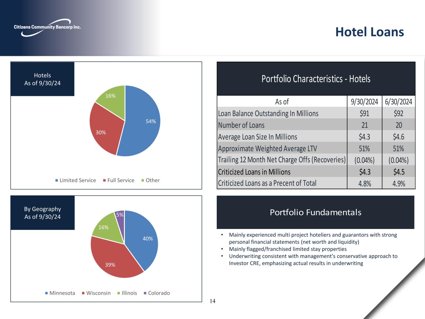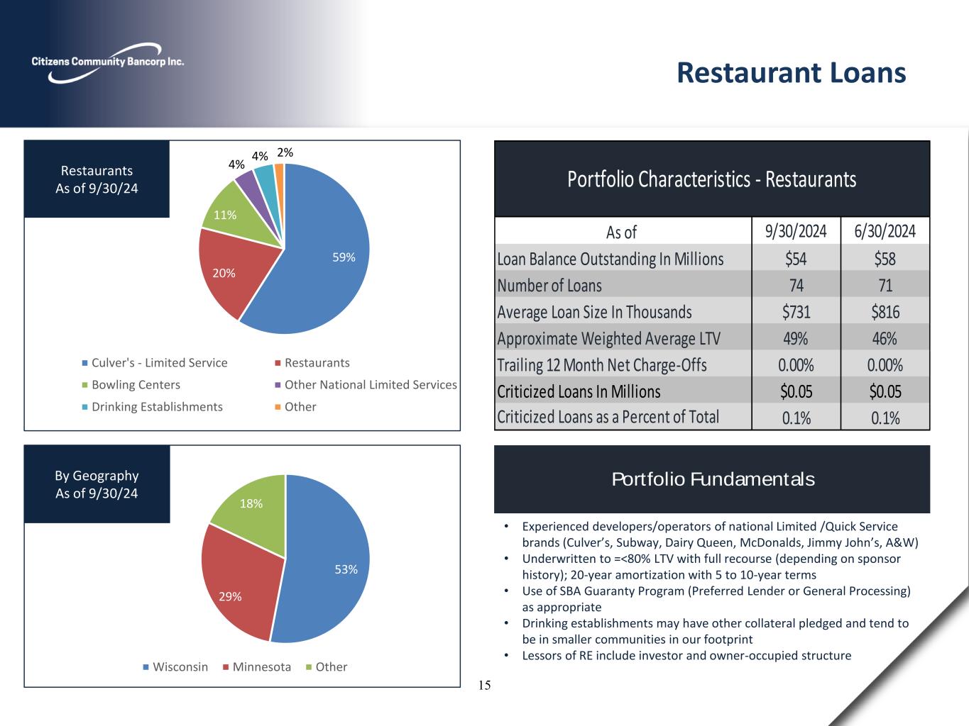 54% 30% 16% Limited Service Full Service Other Hotels As of 9/30/24 Portfolio Fundamentals 40% 39% 16% 5% Minnesota Wisconsin Illinois Colorado By Geography As of 9/30/24 • Mainly experienced multi project hoteliers and guarantors with strong personal financial statements (net worth and liquidity) • Mainly flagged/franchised limited stay properties • Underwriting consistent with management's conservative approach to Investor CRE, emphasizing actual results in underwriting Hotel Loans 9/30/2024 6/30/2024 $91 $92 21 20 $4.3 $4.6 51% 51% (0.04%) (0.04%) Criticized Loans in Millions $4.3 $4.5 4.8% 4.9%Criticized Loans as a Precent of Total As of Number of Loans Trailing 12 Month Net Charge Offs (Recoveries) Portfolio Characteristics - Hotels Loan Balance Outstanding In Millions Average Loan Size In Millions Approximate Weighted Average LTV 14