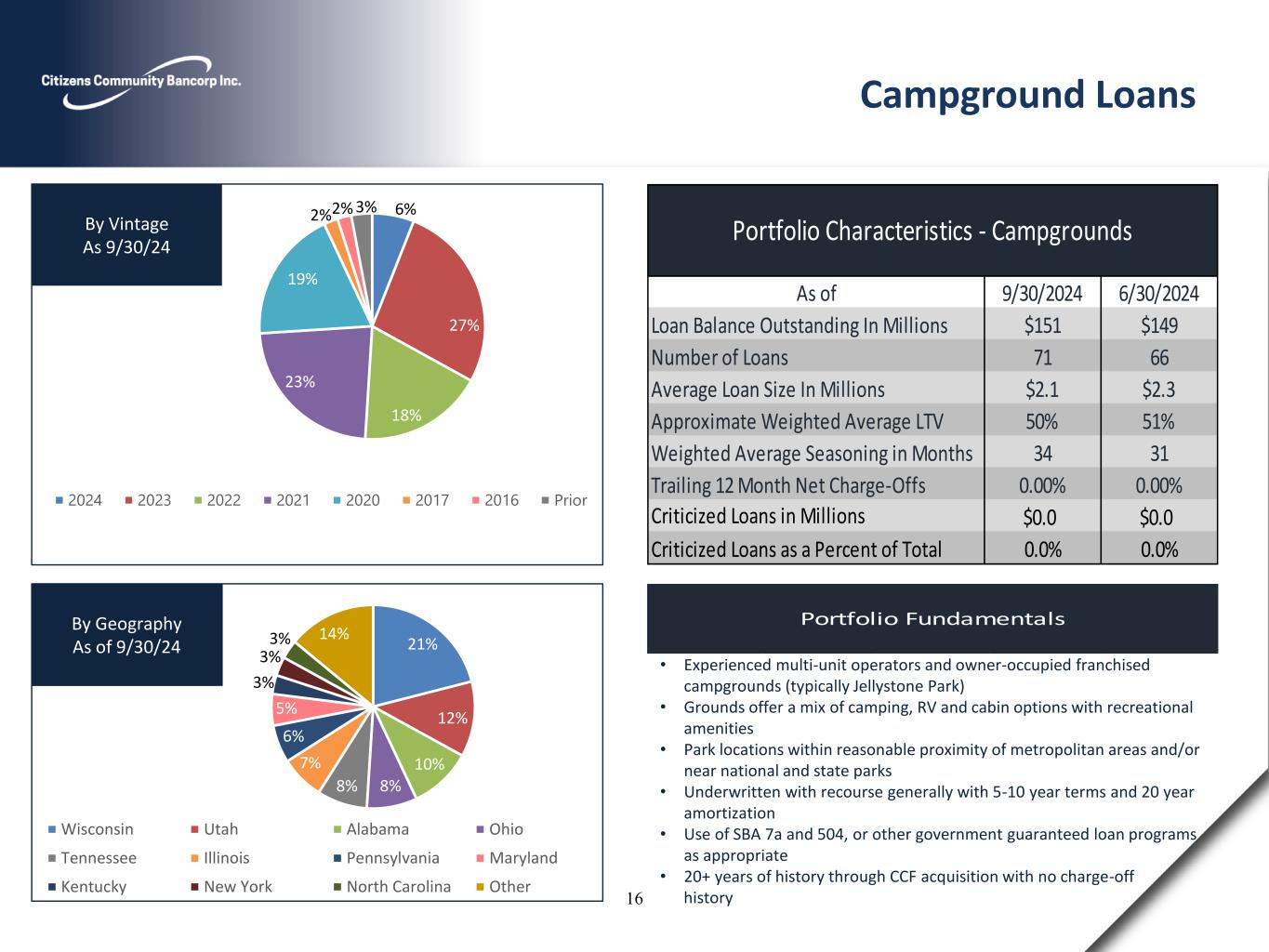 6% 27% 18% 23% 19% 2%2% 3% 2024 2023 2022 2021 2020 2017 2016 Prior By Vintage As 9/30/24 Portfolio Fundamentals 21% 12% 10% 8%8% 7% 6% 5% 3% 3% 3% 14% Wisconsin Utah Alabama Ohio Tennessee Illinois Pennsylvania Maryland Kentucky New York North Carolina Other By Geography As of 9/30/24 • Experienced multi-unit operators and owner-occupied franchised campgrounds (typically Jellystone Park) • Grounds offer a mix of camping, RV and cabin options with recreational amenities • Park locations within reasonable proximity of metropolitan areas and/or near national and state parks • Underwritten with recourse generally with 5-10 year terms and 20 year amortization • Use of SBA 7a and 504, or other government guaranteed loan programs as appropriate • 20+ years of history through CCF acquisition with no charge-off history Campground Loans 9/30/2024 6/30/2024 $151 $149 71 66 $2.1 $2.3 50% 51% 34 31 0.00% 0.00% $0.0 $0.0 Criticized Loans as a Percent of Total 0.0% 0.0% Portfolio Characteristics - Campgrounds As of Weighted Average Seasoning in Months Criticized Loans in Millions Loan Balance Outstanding In Millions Number of Loans Average Loan Size In Millions Approximate Weighted Average LTV Trailing 12 Month Net Charge-Offs 16