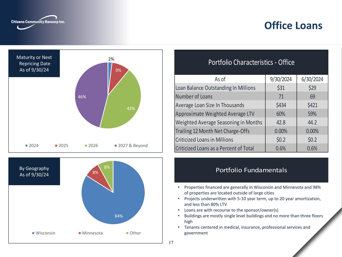 2% 9% 43% 46% 2024 2025 2026 2027 & Beyond Maturity or Next Repricing Date As of 9/30/24 Portfolio Fundamentals 84% 8% 8% Wisconsin Minnesota Other By Geography As of 9/30/24 • Properties financed are generally in Wisconsin and Minnesota and 98% of properties are located outside of large cities • Projects underwritten with 5-10 year term, up to 20 year amortization, and less than 80% LTV • Loans are with recourse to the sponsor/owner(s) • Buildings are mostly single level buildings and no more than three floors high • Tenants centered in medical, insurance, professional services and government Office Loans 9/30/2024 6/30/2024 $31 $29 71 69 $434 $421 60% 59% 42.8 44.2 0.00% 0.00% $0.2 $0.2 0.6% 0.6%Criticized Loans as a Percent of Total Portfolio Characteristics - Office As of Weighted Average Seasoning in Months Criticized Loans in Millions Loan Balance Outstanding In Millions Number of Loans Average Loan Size In Thousands Approximate Weighted Average LTV Trailing 12 Month Net Charge-Offs 17