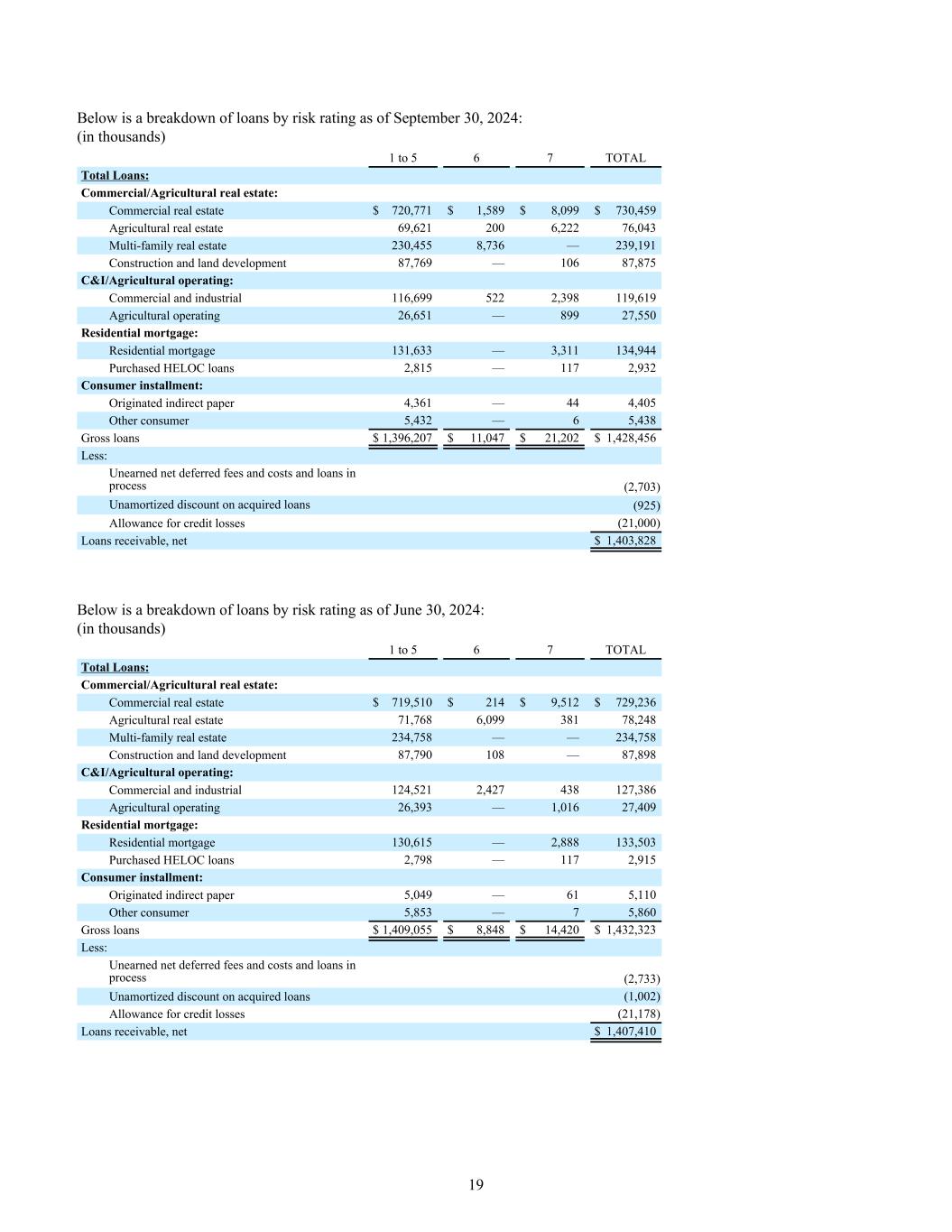 Below is a breakdown of loans by risk rating as of September 30, 2024: (in thousands) 1 to 5 6 7 TOTAL Total Loans: Commercial/Agricultural real estate: Commercial real estate $ 720,771 $ 1,589 $ 8,099 $ 730,459 Agricultural real estate 69,621 200 6,222 76,043 Multi-family real estate 230,455 8,736 — 239,191 Construction and land development 87,769 — 106 87,875 C&I/Agricultural operating: Commercial and industrial 116,699 522 2,398 119,619 Agricultural operating 26,651 — 899 27,550 Residential mortgage: Residential mortgage 131,633 — 3,311 134,944 Purchased HELOC loans 2,815 — 117 2,932 Consumer installment: Originated indirect paper 4,361 — 44 4,405 Other consumer 5,432 — 6 5,438 Gross loans $ 1,396,207 $ 11,047 $ 21,202 $ 1,428,456 Less: Unearned net deferred fees and costs and loans in process (2,703) Unamortized discount on acquired loans (925) Allowance for credit losses (21,000) Loans receivable, net $ 1,403,828 Below is a breakdown of loans by risk rating as of June 30, 2024: (in thousands) 1 to 5 6 7 TOTAL Total Loans: Commercial/Agricultural real estate: Commercial real estate $ 719,510 $ 214 $ 9,512 $ 729,236 Agricultural real estate 71,768 6,099 381 78,248 Multi-family real estate 234,758 — — 234,758 Construction and land development 87,790 108 — 87,898 C&I/Agricultural operating: Commercial and industrial 124,521 2,427 438 127,386 Agricultural operating 26,393 — 1,016 27,409 Residential mortgage: Residential mortgage 130,615 — 2,888 133,503 Purchased HELOC loans 2,798 — 117 2,915 Consumer installment: Originated indirect paper 5,049 — 61 5,110 Other consumer 5,853 — 7 5,860 Gross loans $ 1,409,055 $ 8,848 $ 14,420 $ 1,432,323 Less: Unearned net deferred fees and costs and loans in process (2,733) Unamortized discount on acquired loans (1,002) Allowance for credit losses (21,178) Loans receivable, net $ 1,407,410 19