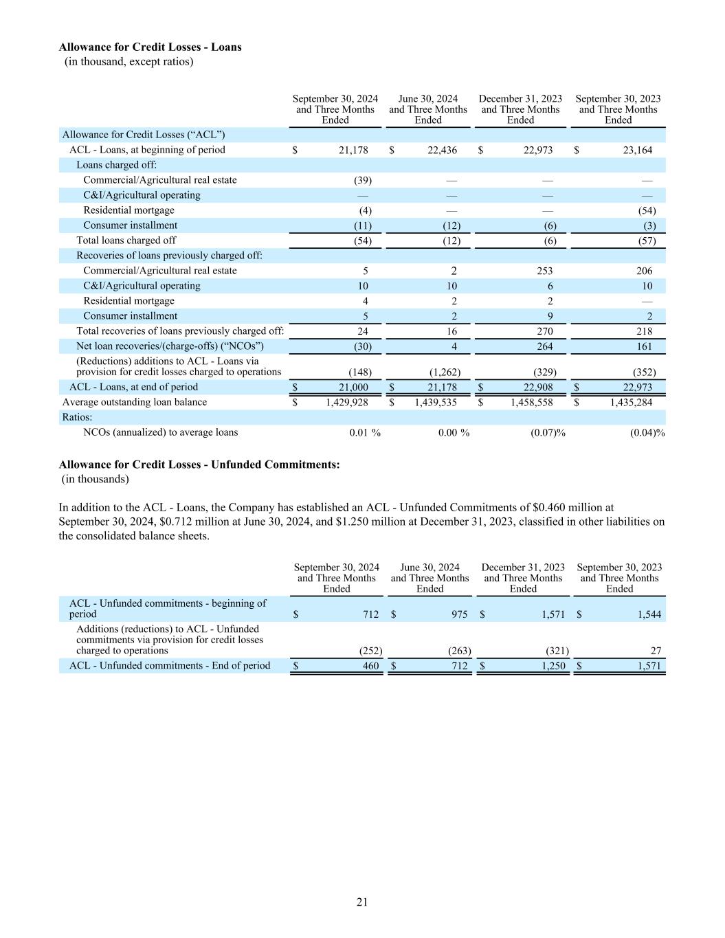 Allowance for Credit Losses - Loans (in thousand, except ratios) September 30, 2024 and Three Months Ended June 30, 2024 and Three Months Ended December 31, 2023 and Three Months Ended September 30, 2023 and Three Months Ended Allowance for Credit Losses (“ACL”) ACL - Loans, at beginning of period $ 21,178 $ 22,436 $ 22,973 $ 23,164 Loans charged off: Commercial/Agricultural real estate (39) — — — C&I/Agricultural operating — — — — Residential mortgage (4) — — (54) Consumer installment (11) (12) (6) (3) Total loans charged off (54) (12) (6) (57) Recoveries of loans previously charged off: Commercial/Agricultural real estate 5 2 253 206 C&I/Agricultural operating 10 10 6 10 Residential mortgage 4 2 2 — Consumer installment 5 2 9 2 Total recoveries of loans previously charged off: 24 16 270 218 Net loan recoveries/(charge-offs) (“NCOs”) (30) 4 264 161 (Reductions) additions to ACL - Loans via provision for credit losses charged to operations (148) (1,262) (329) (352) ACL - Loans, at end of period $ 21,000 $ 21,178 $ 22,908 $ 22,973 Average outstanding loan balance $ 1,429,928 $ 1,439,535 $ 1,458,558 $ 1,435,284 Ratios: NCOs (annualized) to average loans 0.01 % 0.00 % (0.07) % (0.04) % Allowance for Credit Losses - Unfunded Commitments: (in thousands) In addition to the ACL - Loans, the Company has established an ACL - Unfunded Commitments of $0.460 million at September 30, 2024, $0.712 million at June 30, 2024, and $1.250 million at December 31, 2023, classified in other liabilities on the consolidated balance sheets. September 30, 2024 and Three Months Ended June 30, 2024 and Three Months Ended December 31, 2023 and Three Months Ended September 30, 2023 and Three Months Ended ACL - Unfunded commitments - beginning of period $ 712 $ 975 $ 1,571 $ 1,544 Additions (reductions) to ACL - Unfunded commitments via provision for credit losses charged to operations (252) (263) (321) 27 ACL - Unfunded commitments - End of period $ 460 $ 712 $ 1,250 $ 1,571 21
