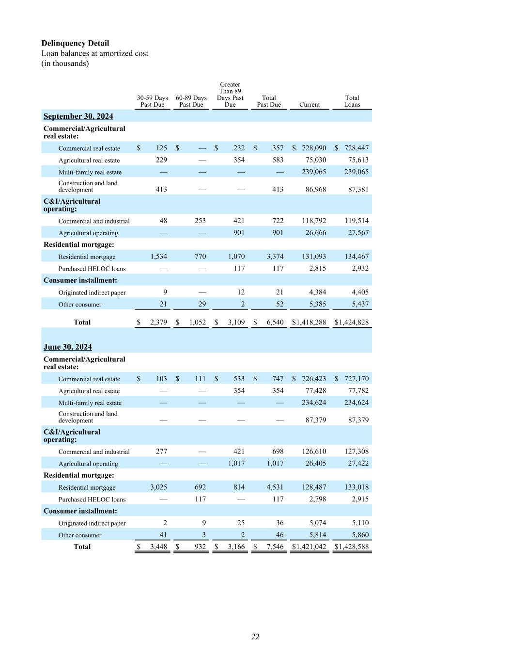 Delinquency Detail Loan balances at amortized cost (in thousands) 30-59 Days Past Due 60-89 Days Past Due Greater Than 89 Days Past Due Total Past Due Current Total Loans September 30, 2024 Commercial/Agricultural real estate: Commercial real estate $ 125 $ — $ 232 $ 357 $ 728,090 $ 728,447 Agricultural real estate 229 — 354 583 75,030 75,613 Multi-family real estate — — — — 239,065 239,065 Construction and land development 413 — — 413 86,968 87,381 C&I/Agricultural operating: Commercial and industrial 48 253 421 722 118,792 119,514 Agricultural operating — — 901 901 26,666 27,567 Residential mortgage: Residential mortgage 1,534 770 1,070 3,374 131,093 134,467 Purchased HELOC loans — — 117 117 2,815 2,932 Consumer installment: Originated indirect paper 9 — 12 21 4,384 4,405 Other consumer 21 29 2 52 5,385 5,437 Total $ 2,379 $ 1,052 $ 3,109 $ 6,540 $ 1,418,288 $ 1,424,828 June 30, 2024 Commercial/Agricultural real estate: Commercial real estate $ 103 $ 111 $ 533 $ 747 $ 726,423 $ 727,170 Agricultural real estate — — 354 354 77,428 77,782 Multi-family real estate — — — — 234,624 234,624 Construction and land development — — — — 87,379 87,379 C&I/Agricultural operating: Commercial and industrial 277 — 421 698 126,610 127,308 Agricultural operating — — 1,017 1,017 26,405 27,422 Residential mortgage: Residential mortgage 3,025 692 814 4,531 128,487 133,018 Purchased HELOC loans — 117 — 117 2,798 2,915 Consumer installment: Originated indirect paper 2 9 25 36 5,074 5,110 Other consumer 41 3 2 46 5,814 5,860 Total $ 3,448 $ 932 $ 3,166 $ 7,546 $ 1,421,042 $ 1,428,588 22