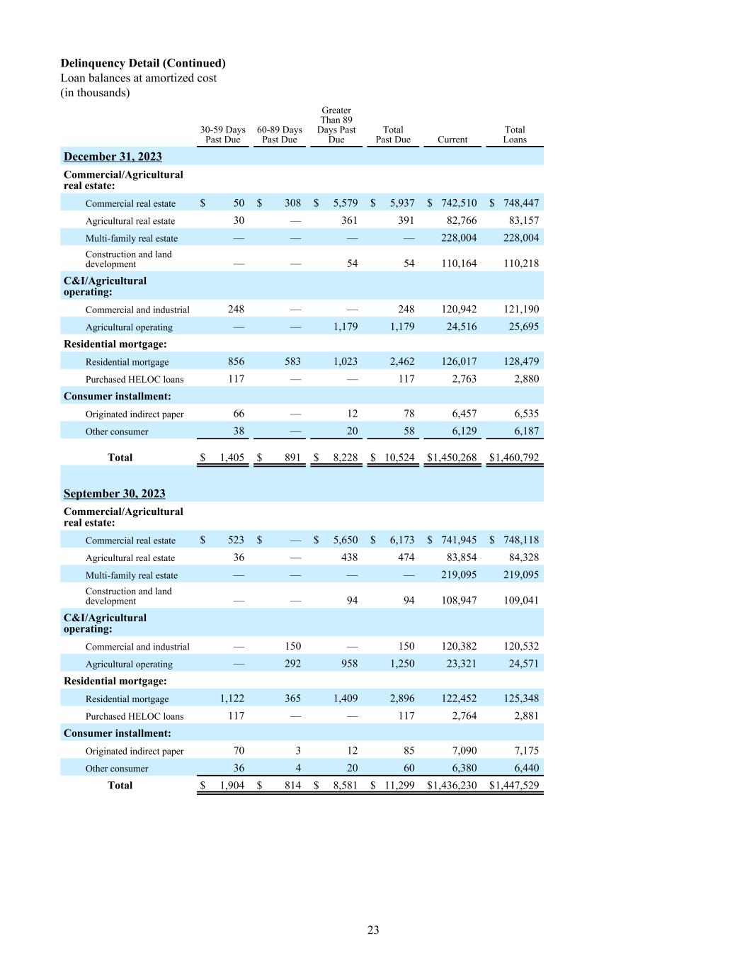 Delinquency Detail (Continued) Loan balances at amortized cost (in thousands) 30-59 Days Past Due 60-89 Days Past Due Greater Than 89 Days Past Due Total Past Due Current Total Loans December 31, 2023 Commercial/Agricultural real estate: Commercial real estate $ 50 $ 308 $ 5,579 $ 5,937 $ 742,510 $ 748,447 Agricultural real estate 30 — 361 391 82,766 83,157 Multi-family real estate — — — — 228,004 228,004 Construction and land development — — 54 54 110,164 110,218 C&I/Agricultural operating: Commercial and industrial 248 — — 248 120,942 121,190 Agricultural operating — — 1,179 1,179 24,516 25,695 Residential mortgage: Residential mortgage 856 583 1,023 2,462 126,017 128,479 Purchased HELOC loans 117 — — 117 2,763 2,880 Consumer installment: Originated indirect paper 66 — 12 78 6,457 6,535 Other consumer 38 — 20 58 6,129 6,187 Total $ 1,405 $ 891 $ 8,228 $ 10,524 $ 1,450,268 $ 1,460,792 September 30, 2023 Commercial/Agricultural real estate: Commercial real estate $ 523 $ — $ 5,650 $ 6,173 $ 741,945 $ 748,118 Agricultural real estate 36 — 438 474 83,854 84,328 Multi-family real estate — — — — 219,095 219,095 Construction and land development — — 94 94 108,947 109,041 C&I/Agricultural operating: Commercial and industrial — 150 — 150 120,382 120,532 Agricultural operating — 292 958 1,250 23,321 24,571 Residential mortgage: Residential mortgage 1,122 365 1,409 2,896 122,452 125,348 Purchased HELOC loans 117 — — 117 2,764 2,881 Consumer installment: Originated indirect paper 70 3 12 85 7,090 7,175 Other consumer 36 4 20 60 6,380 6,440 Total $ 1,904 $ 814 $ 8,581 $ 11,299 $ 1,436,230 $ 1,447,529 23