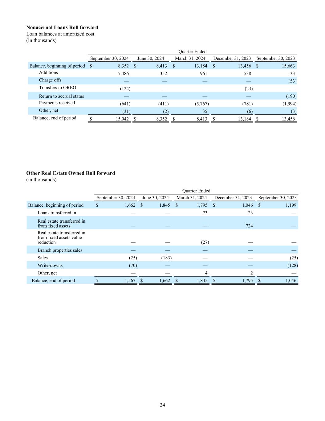 Nonaccrual Loans Roll forward Loan balances at amortized cost (in thousands) Quarter Ended September 30, 2024 June 30, 2024 March 31, 2024 December 31, 2023 September 30, 2023 Balance, beginning of period $ 8,352 $ 8,413 $ 13,184 $ 13,456 $ 15,663 Additions 7,486 352 961 538 33 Charge offs — — — — (53) Transfers to OREO (124) — — (23) — Return to accrual status — — — — (190) Payments received (641) (411) (5,767) (781) (1,994) Other, net (31) (2) 35 (6) (3) Balance, end of period $ 15,042 $ 8,352 $ 8,413 $ 13,184 $ 13,456 Other Real Estate Owned Roll forward (in thousands) Quarter Ended September 30, 2024 June 30, 2024 March 31, 2024 December 31, 2023 September 30, 2023 Balance, beginning of period $ 1,662 $ 1,845 $ 1,795 $ 1,046 $ 1,199 Loans transferred in — — 73 23 — Real estate transferred in from fixed assets — — — 724 — Real estate transferred in from fixed assets value reduction — — (27) — — Branch properties sales — — — — — Sales (25) (183) — — (25) Write-downs (70) — — — (128) Other, net — — 4 2 — Balance, end of period $ 1,567 $ 1,662 $ 1,845 $ 1,795 $ 1,046 24